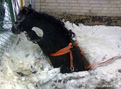 Кінь намагається вибратися із силосної ями, у яку впав в одному з сіл Ковельського району 2 лютого.