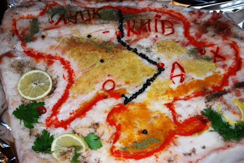 Один з сальних фанатів – Юрій Просвіров – намалював на шматку сала карту України. Каже, витратив 200 гривень на продукт та 50 гривень на спеції. Працював всю ніч. Віддавати картину шкода, проте сказав, що запасся салом в шоколаді, тому без свинини не обійдеться.