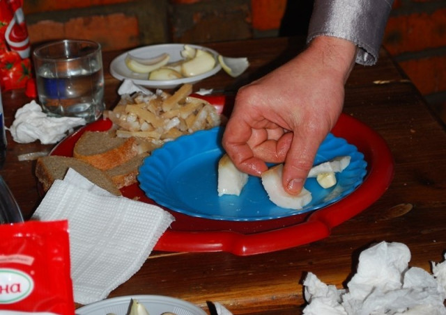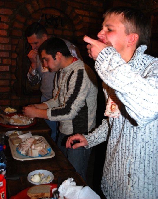 Таке фоторепортер «ВН» побачив учора під час четвертого чемпіонату любителів сала «З любов’ю до ...сала» в Луцьку в пивному клубі «Майдан».