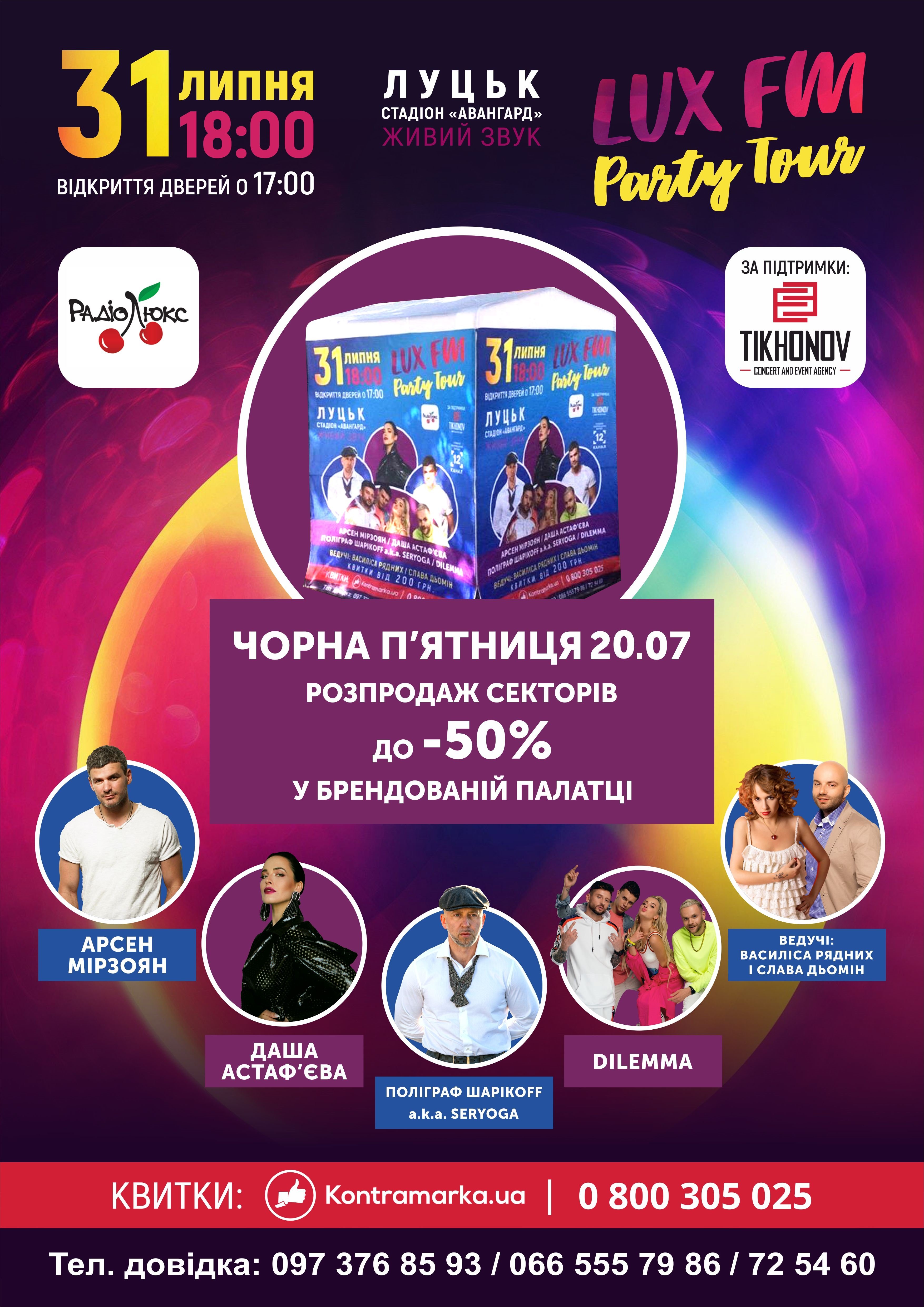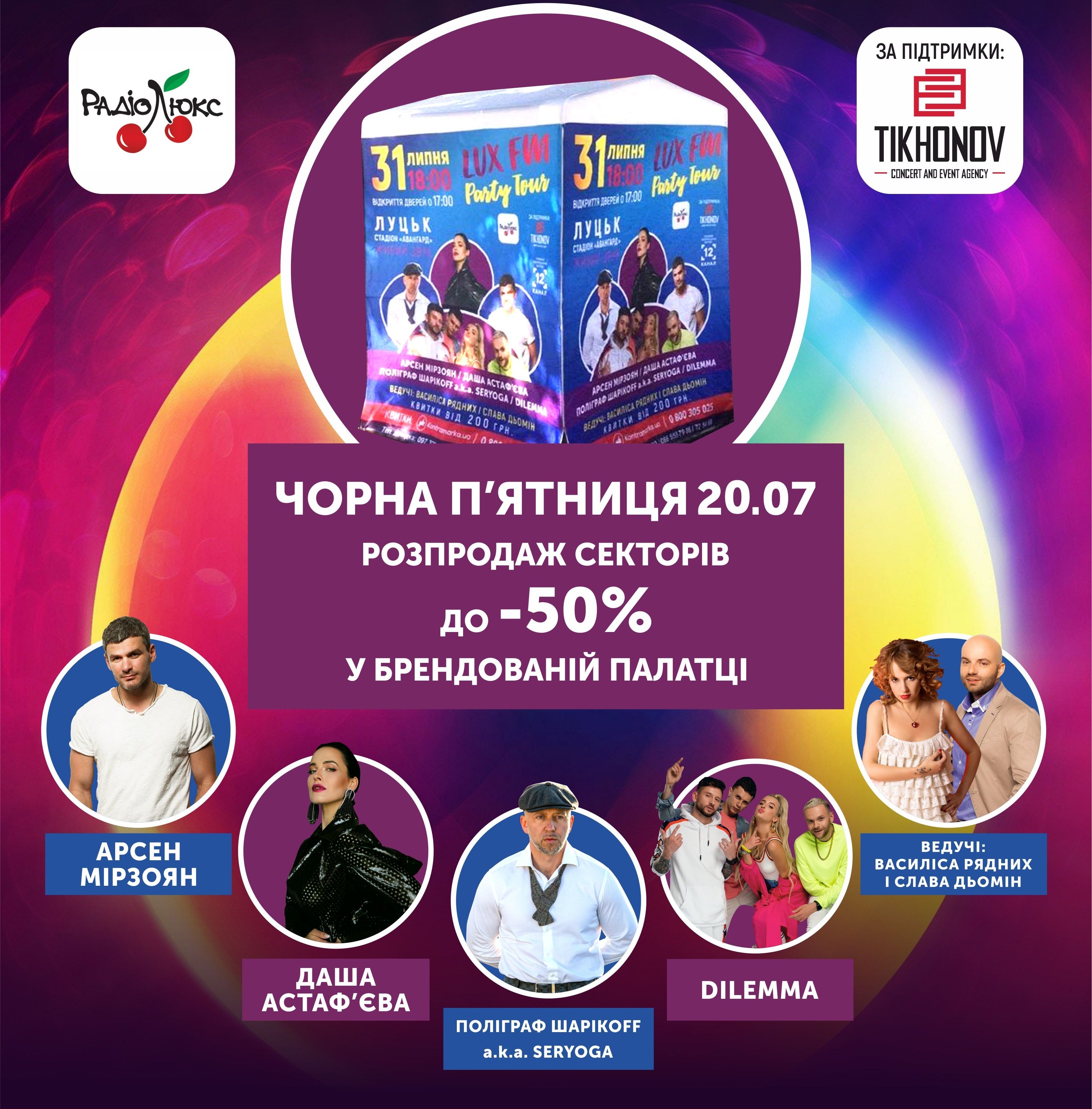 Радіо «Люкс ФМ» за підтримки луцької івент-агенції Tikhonov сoncert and event agency організовують 31 липня на стадіоні «Авангард» масштабне дійство, на якому крім зіркових артистів: Арсен Мірзоян, Даша Астаф’єва, ПОЛІГРАФ ШАРІКOFF a.k.a. SERYOGA, гурту «DILEMMA» та ведучих Слави Дьоміна і Василіси Рядних, команда організаторів підготувала надзвичайно багато сюрпризів, подарунків та акцій.