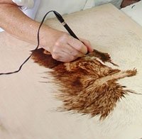 Сучасні пристрої для пірографії більше схожі на машинки для татуювань. Змінні насадки у них із надтонкими кінчиками, аби максимально точно окреслювати контури, коригувати тіні і півтони, підкреслювати найдрібніші деталі зображення.