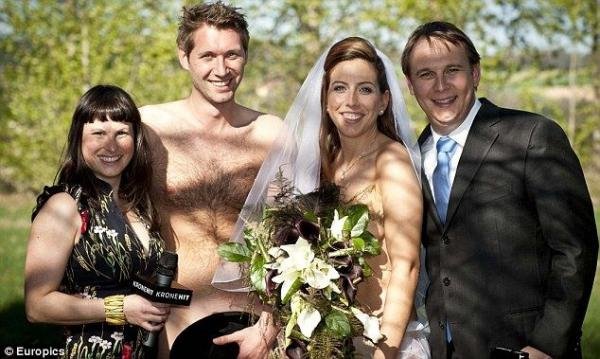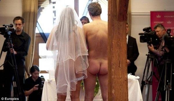 Австрійська пара влаштували собі «голе» весілля, з'явившись на церемонію практично без одягу – на нареченій була білизна тілесного кольору, фата і туфлі, а на нареченому лише капелюх.