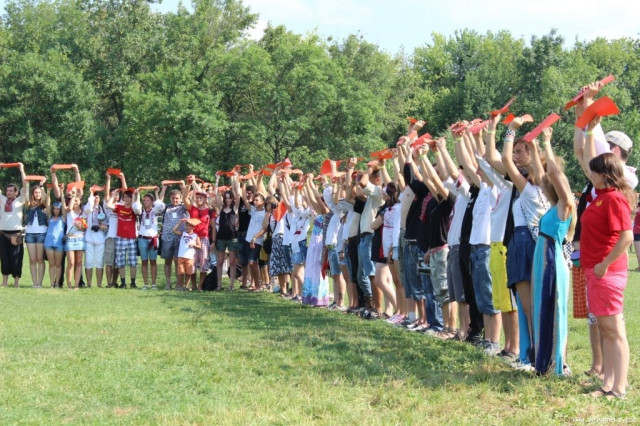 Згодом молоді люди, щоправда, у трохи меншій кількості, взяли участь у флеш-мобі. Вони своїми тілами утворили напис «УПА». Його фотографували із неба.