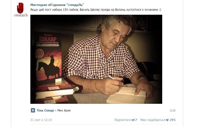 Зазначимо, що організатори заходу – мистецьке об’єднання «стендаЛь» – раніше проводило акцію у соцмережі, щоб вирішити, чи запрошувати Василя Шкляра у Луцьк. Суть її була в тому, щоб набрати 150 лайків під постом із фотографією автора. Пост набрав майже в два рази більше – 295 позначок «мені подобається».