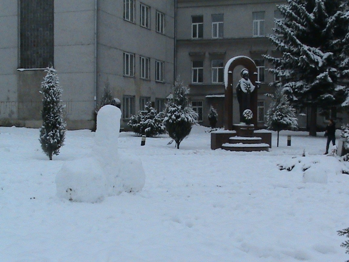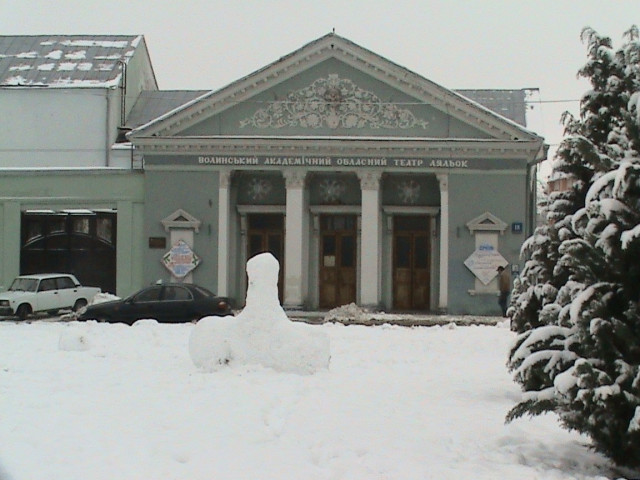 Невідомі скульптори-бешкетники виліпили біля приміщення Луцької міської ради снігову скульптуру загадкової форми.