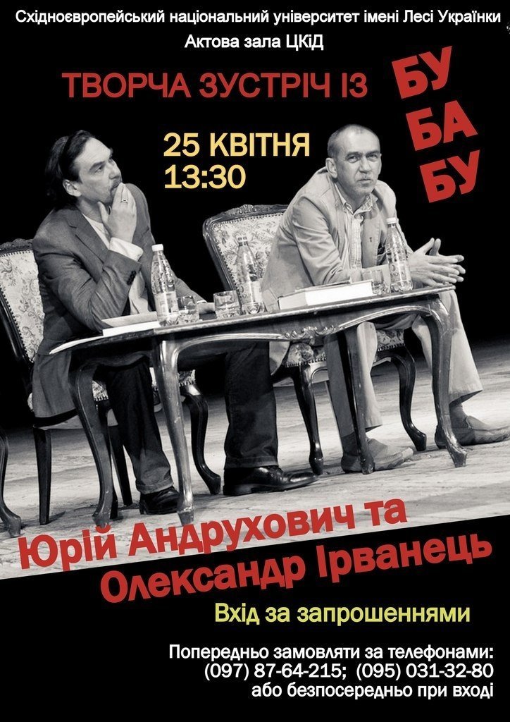 Так, славнозвісні учасники літературного угрупування «Бу-Ба-Бу» Юрій Андрухович та Олександр Ірванець приїдуть в Луцьк у четвер, 25 квітня.