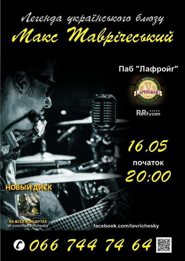 17 травня (на афіші вказана помилкова дата 16.05) в пабі «Лафройг» — легенда українського блюзу Макс Таврический. «Макс Таврический - виконавець акустичного блюзу, який живе в Києві, родом з Херсона. Це типовий сонгстер (збирач пісень) - у його репертуарі різнопланові за жанром композиції, але виконані в певній і впізнаваною манері»