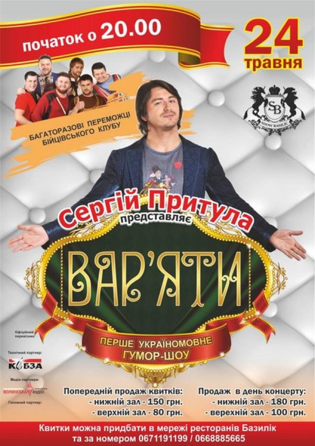 24 травня о 20:00 в «Шоу базилік» Сергій Притула представляє «Вар`яти» — перше українське гумор-шоу. Попередній продаж квитків 80-150 грн.