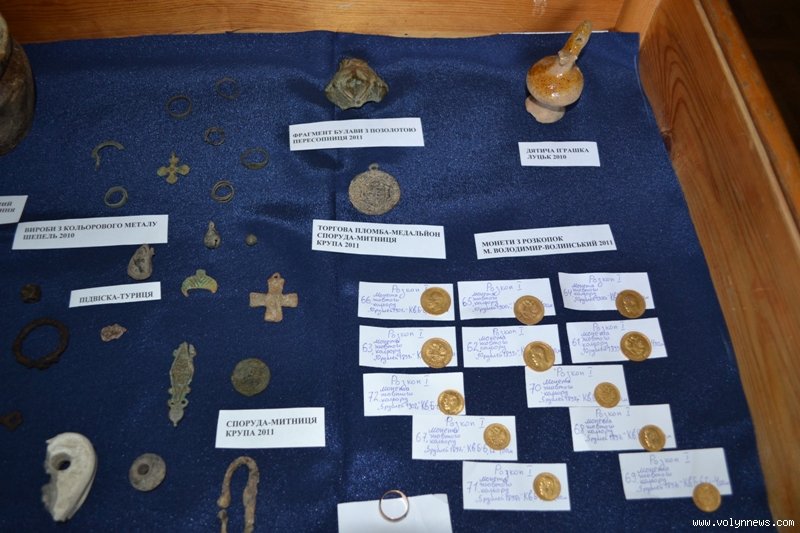 Щороку близько десяти тисяч таких знахідок поповнюють фонди волинських музеїв. На виставці представлені: славнозвісний медальйон з Крупи, уламок позолоченої булави з Пересопниці, енкопліони, наконечники стріл, кам’яні знаряддя, монети та інші артефакти.