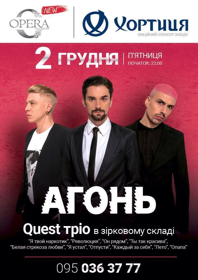Зіркове тріо представить лучанам улюблені хіти: "Я твой наркотик", "Ты так красива", "Он рядом", "Белая стрекоза любви", "Я устал", "Отпусти".