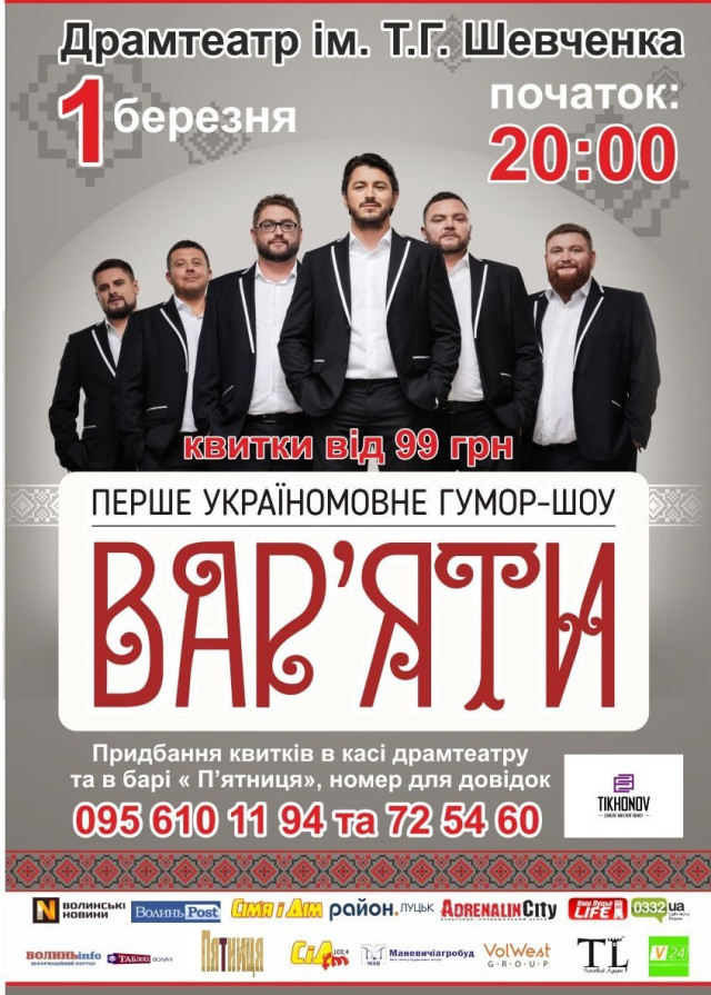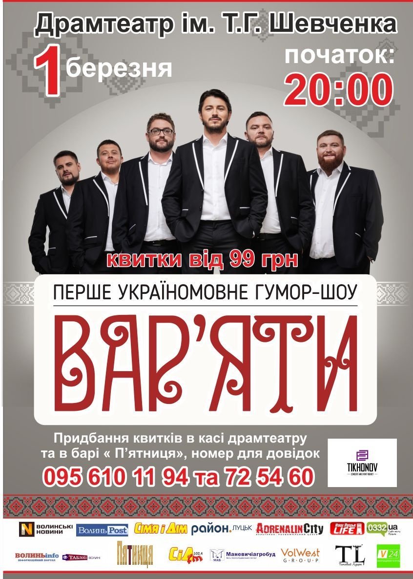 Вкотре, уже за традицією, 1 березня о 20:00 в приміщенні драмтеатру ім.Т.Г.Шевченка відбудеться концерт Першого Україномовного Гумор Шоу "Вар'яти" та Сергія Притули.