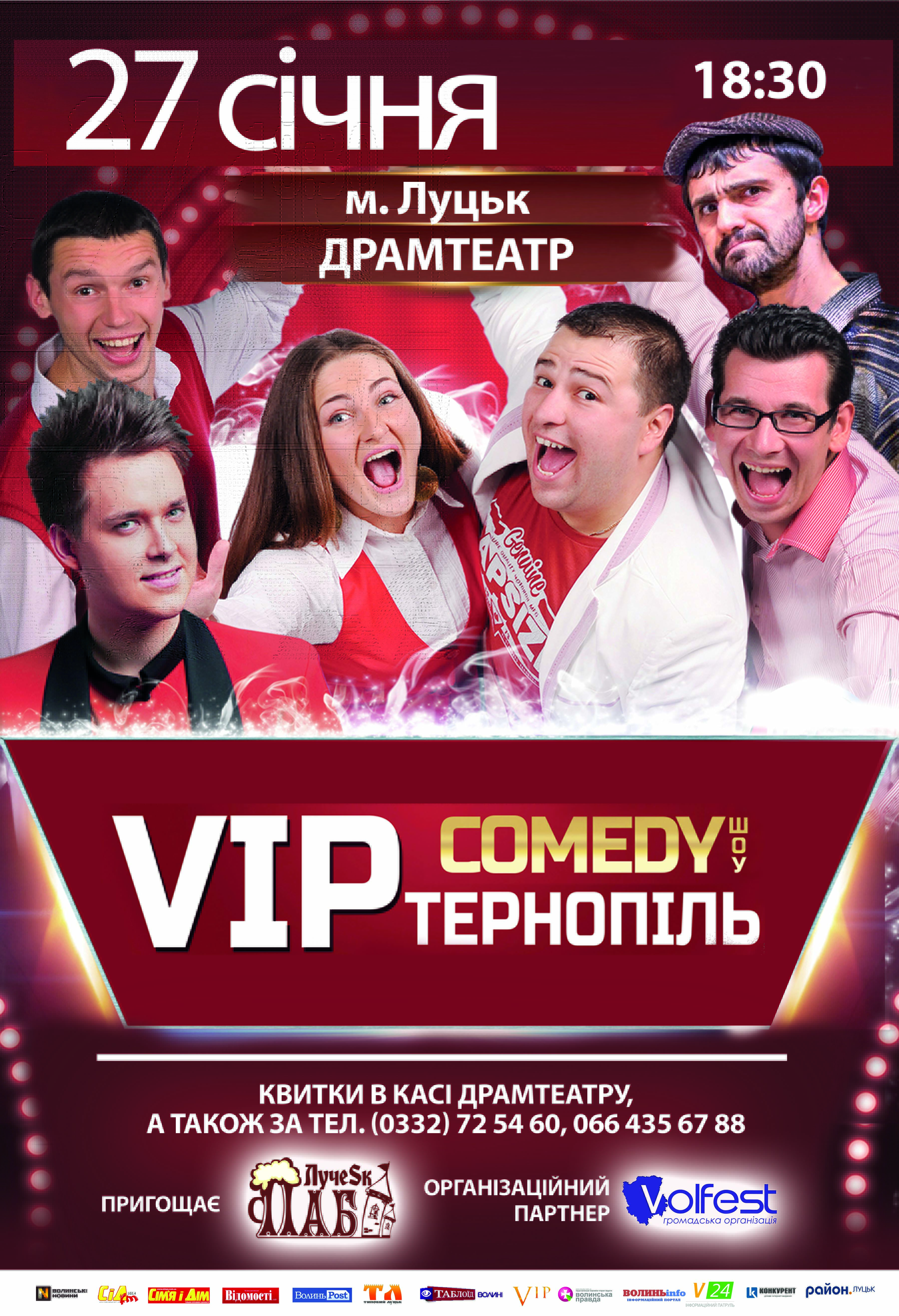 27 січня до Луцька завітає одна з найкращих гумористичних команд України, неодноразові переможці шоу "Розсміши коміка", півфіналісти 1-го та срібні призери 2-го сезонів «Ліги сміху», переможці Літнього кубку Ліги Сміху 2016 у Юрмалі, актори і автори скетчкому "Країна У" та сіткому "Одного разу під Полтавою"- команда VIP Тернопіль із власним камеді шоу, інформують організатори.