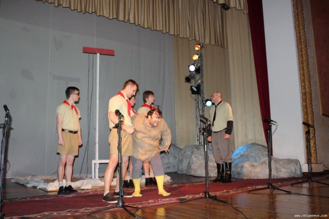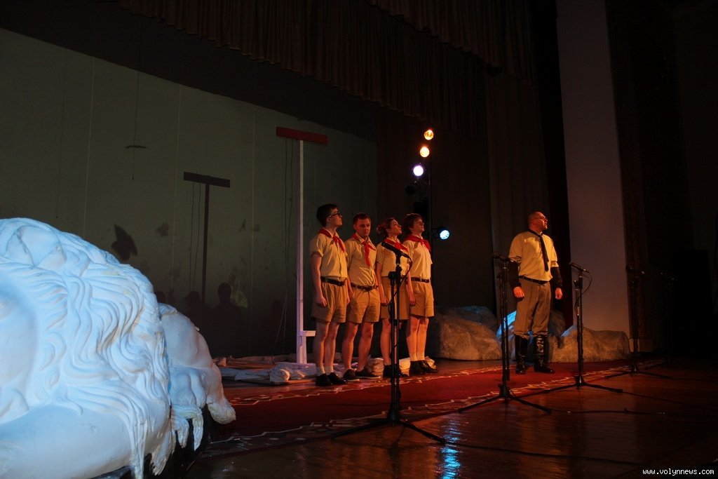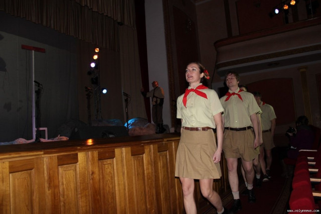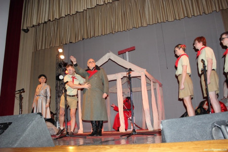 На початку вистави залом на сцену вийшов піонерський загін на чолі з Учителем атеїзму, співаючи пісню про Сталіна.