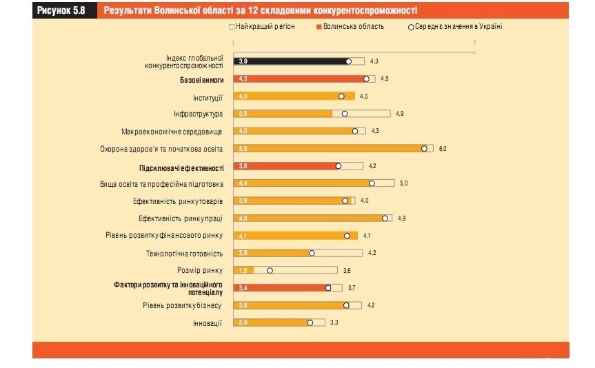 Волинь посідає перше місце за рівнем розвитку фінансового ринку та за складовою «інституції». Водночас погані оцінки отримали транспортна і комунікаційна інфраструктури регіону.