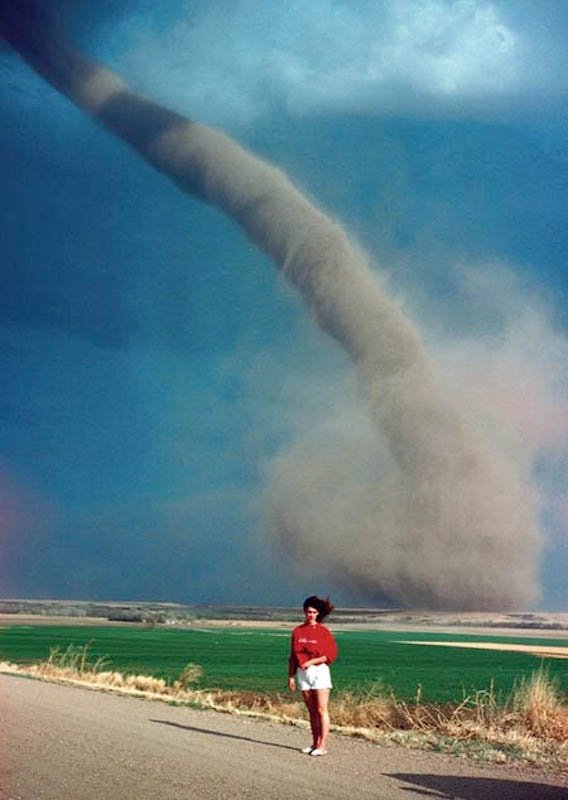 За історію фотомистецтва було зроблено безліч фантастичних знімків торнадо, але жоден з них не може зрівнятися з цим. Безтурботна Одра Томас фотографується в той момент, коли торнадо класу Ф1 мчить у напрямку до ферми її сім'ї. Дівчина знаходиться всього за милю від урагану.