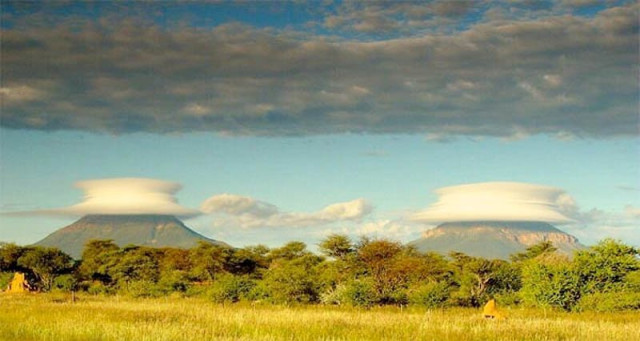 Це - фотографія двох лінзовидних хмарних формацій над піками гір Оматако поруч з Отіваронго, що у Республіці Намібія.