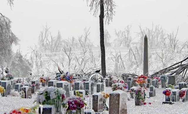 Ця дивна фотографія була зроблена на кладовищі в північно-західному Арканзасі після руйнівного крижаного шторму 27-28 січня 2009 року. Лід товщиною до п'яти сантиметрів нашарувався на більшість горизонтальних поверхонь.