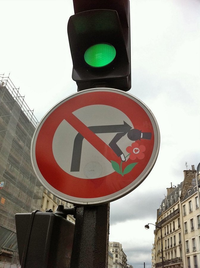 На сайті «bigpicture» опублікували підбірку фотографій, на яких зображені незвичні дорожні знаки. Оригінальними знаки робить французький художник і скульптор Клет Абрахам. Митець клеїть на знаки стікери, художнє зображення яких, абсолютно не заважає розумінню дорожніх вказівників.