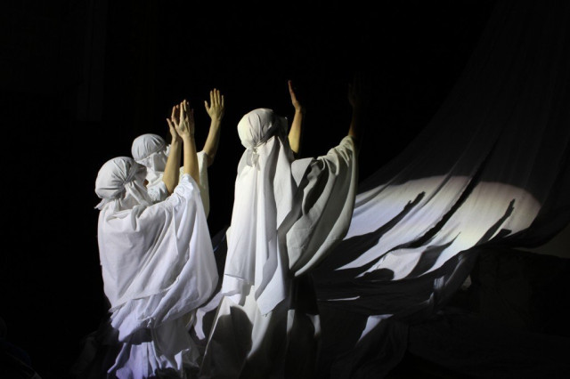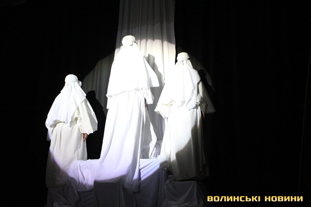 Вистава розпочалася, глядачі відразу відчули напруження. Світло вимкнули і зал на кілька затяжних хвилин поринув у темряву. Звучала моторошна музика, яка навіювала тривожні думки. Десь із коридорів, ніби з-за спини глядачів, в напрямку сцени йшли дівчата. Вони були загорнуті у білі простирадла, не менш бліді і на обличчях. Стало справді страшно. Все це дійство – із музикою, темрявою, яка потім змінилася напівтемрявою, блуканням хору затягувалося. Нарешті дівчата зупинилися перед сценою і завмерли. Складалося враження, що нічого не відбувається. Та насправді в той момент нічого не відбувалося лише на сцені. Натомість все переверталося у глядача в душі. Саме так, як сказала режисер. Не встигла вистава «набрати обертів», а бажаного ефекту уже досягнули.