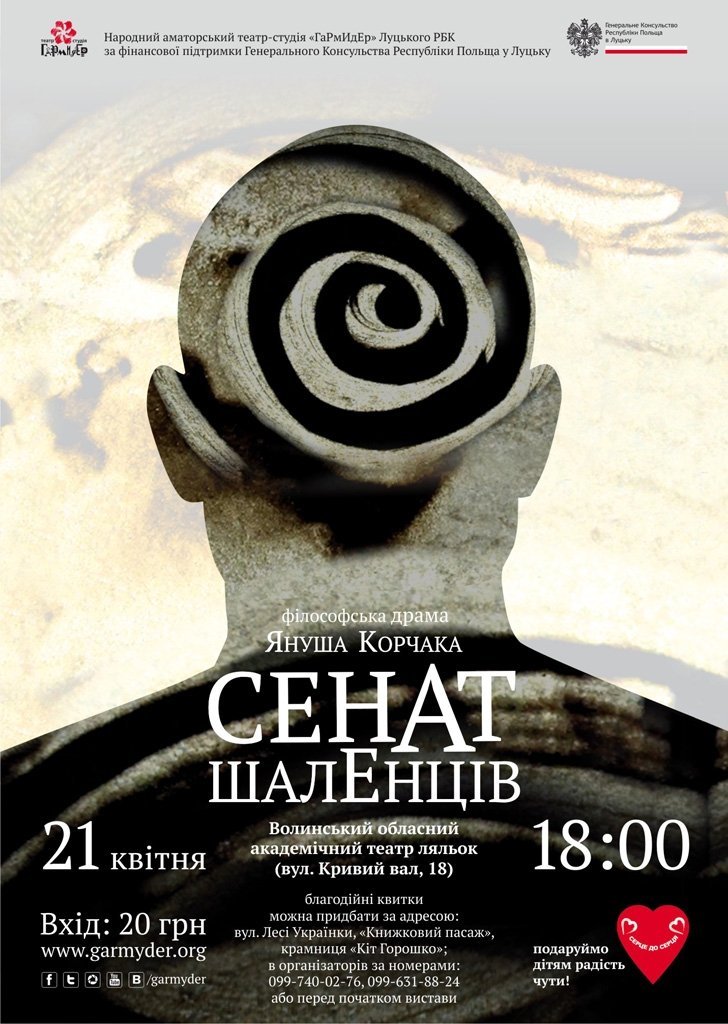 Благодійний показ філософської драми «Сенат шаленців» відбудеться 21 квітня о 18:00 за адресою вулиця Кривий Вал, 18, у Волинському академічному обласному театрі ляльок.