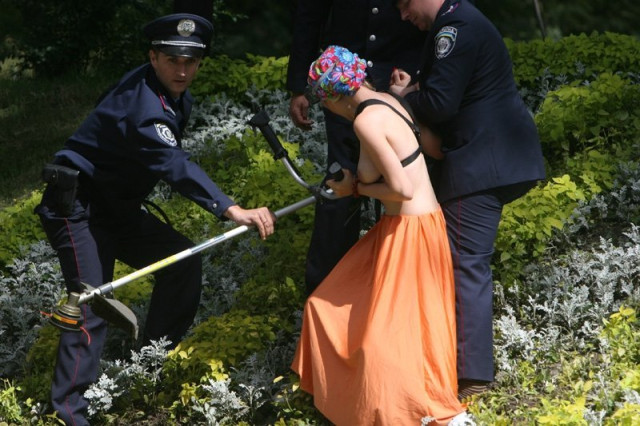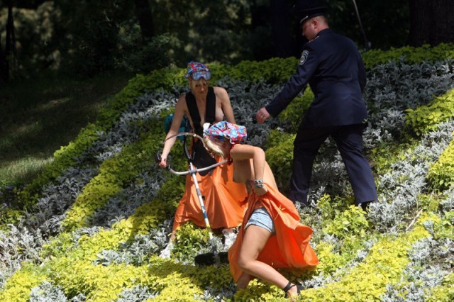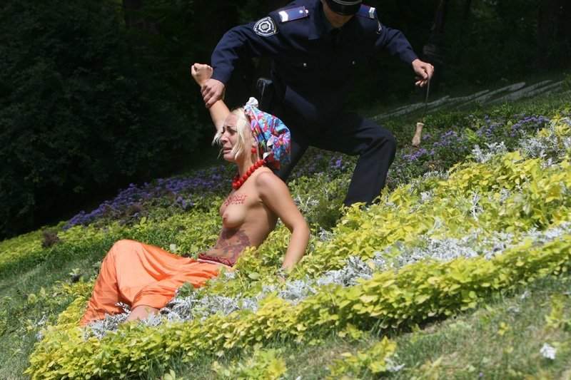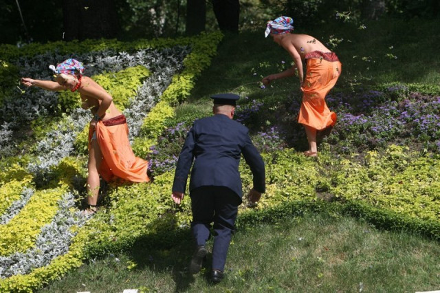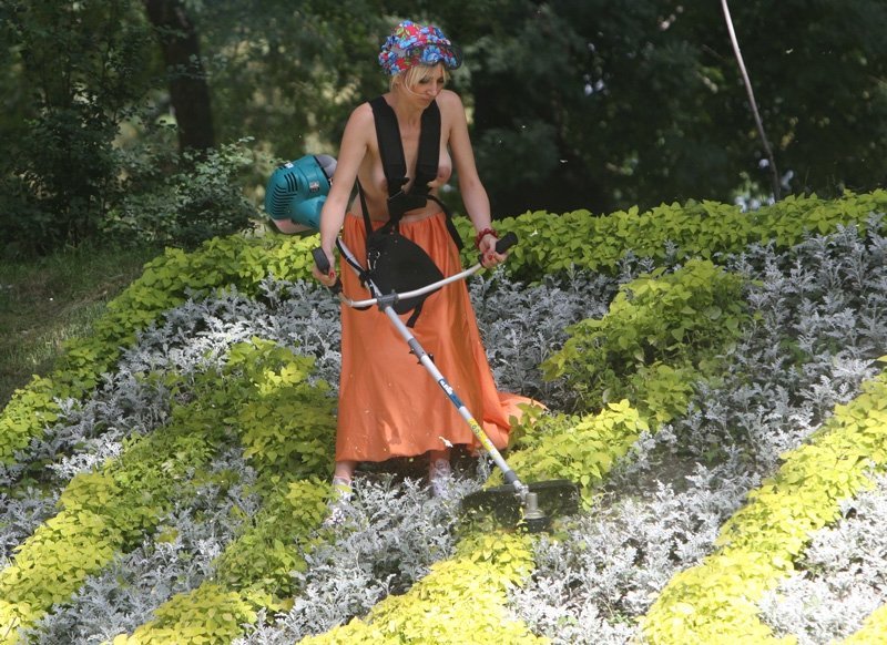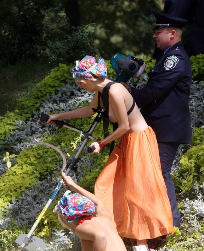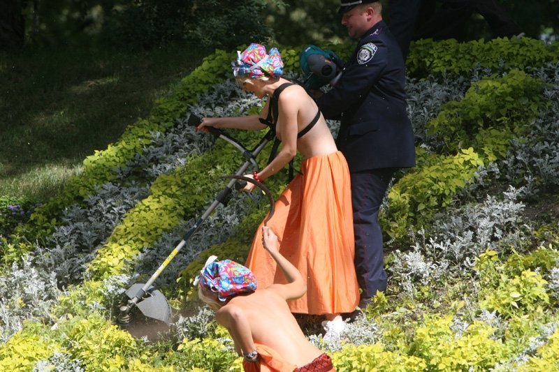 Напівоголені дівчата з серпами та газонокосарками викошували траву, вигукуючи "Хай живе, залежність!", "З Днем залежності!". Газон було майже повністю знищено. Одну з активісток затримала міліція.