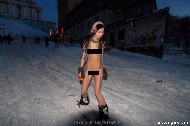 На днях мешканці столиці України могли спостерігати незвичайну картину: дві оголені дівчини спускалися з Андріївського узвозу на сноубордах.