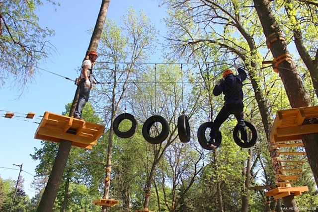 Не дивлячись на незручне для такого виду розваг взуття, мер таки пройшовся новозведеною «канатною дорогою» протяжністю у 130 метрів на висоті 3-4 метри від землі.