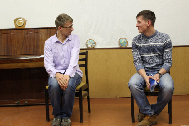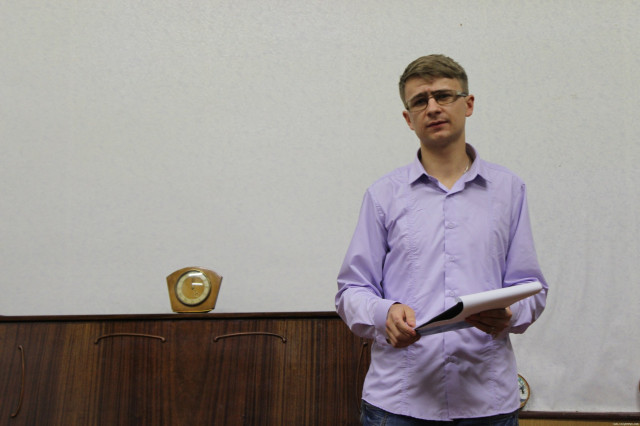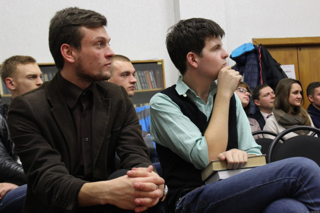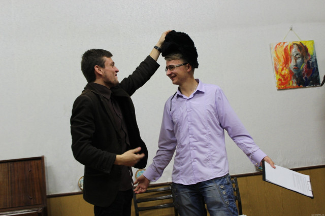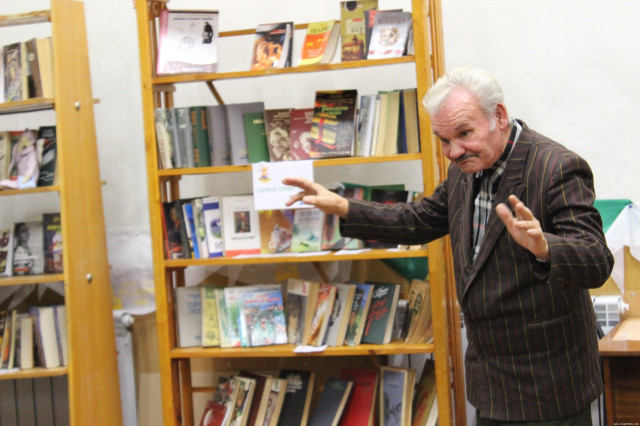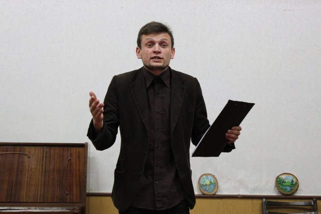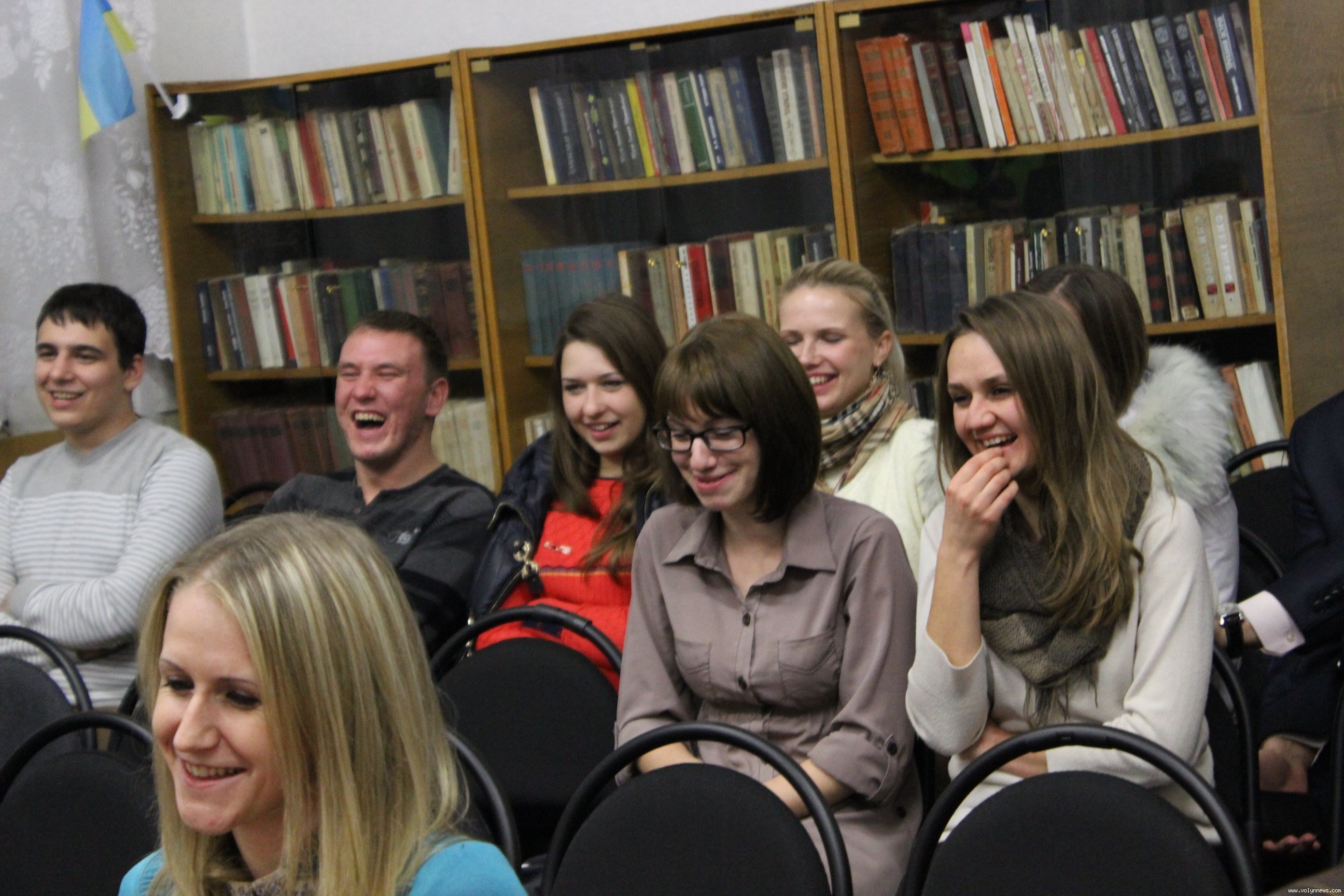 Так, біля імпровізованої сцени зібралось близько двох десятків поціновувачів інтелектуального українського гумору – це і молодь, і люди поважного віку. Серед них, викладач із 46-річним стажем, а також автор та гуморист Володимир Ткаченко.