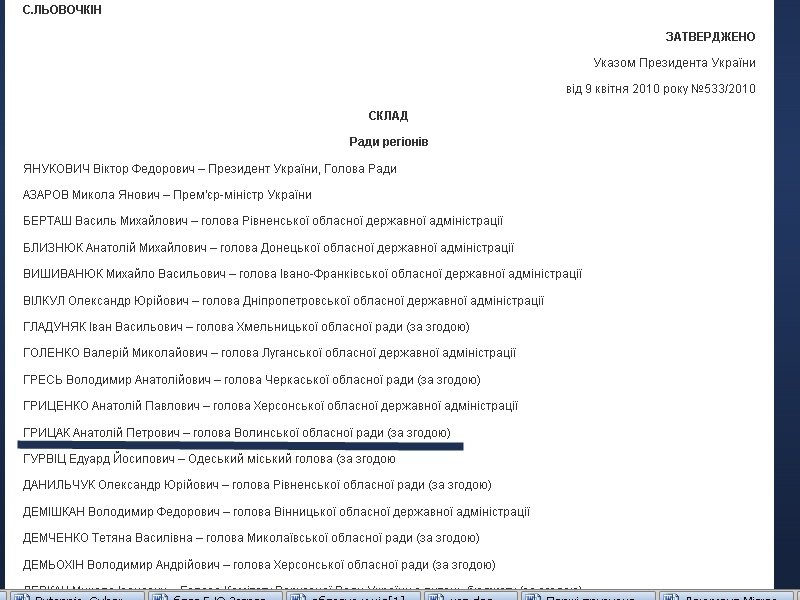 На офіційному сайті Президета у складі Ради регіонів, затвердженому президентським указом та підписаним главою АП Сергієм Льовочкіним, прізвище голови Волиньради вказано з помилкою: ГРИЦАК Анатолій Петрович.