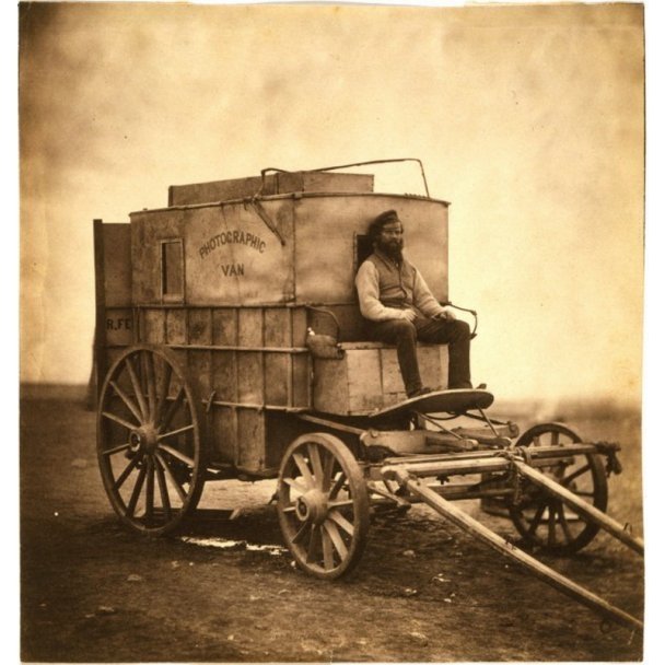 Британець Роджер Фентон вважається першим військовим фотографом. Фото його фургона на Кримській війні.