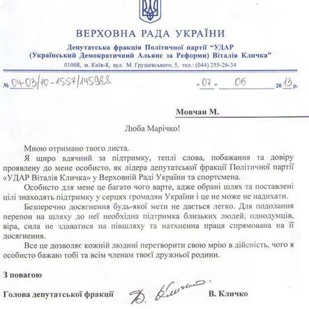Юна ковельчанка отримала новий лист - тепер від Кличка. ФОТО