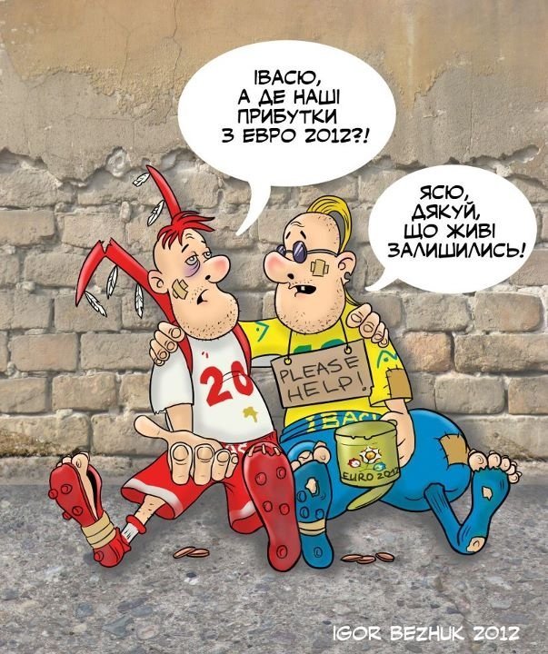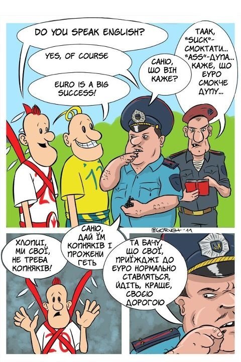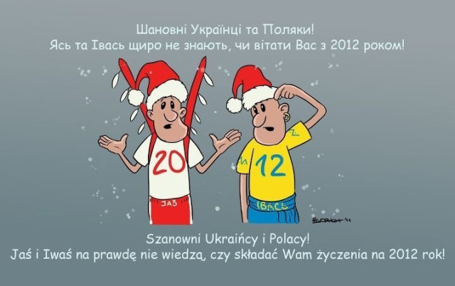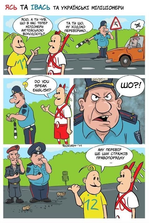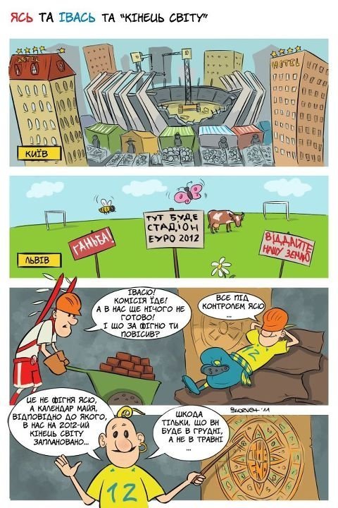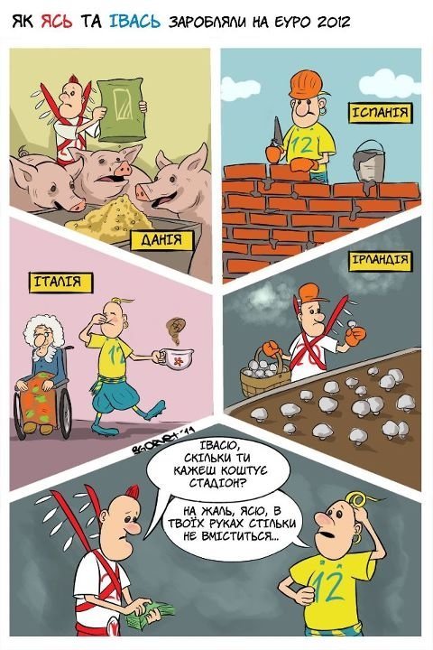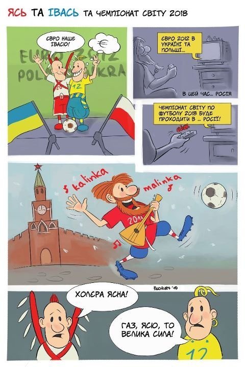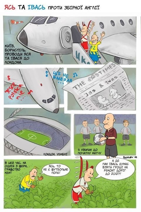 У декількох сюжетах коміксу поляк Ясь та українець Івась, вималювані, до слова, в національних стилях ‒ українець одягнений у синьо-жовту форму, має козацькі оселедець та сережку у вусі ‒ показують реалії підготовки до Євро-2012. Із іронією, а іноді сарказмом, розповідають про будівництво стадіонів в Україні, кепкують над правоохоронцями через незнання англійської і навіть самі заробляють гроші для будівництва доріг.
