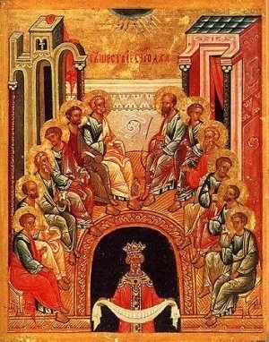 За переказами, після вознесіння Ісуса Христа настав десятий день: це був п'ятидесятий день після Воскресіння Христова. У євреїв було велике свято П'ятидесятниці в пам'ять Синайського законодавства. Так, всі апостоли разом з Божою Матір'ю, учнями Христовими та іншими віруючими перебували в одній світлиці в Єрусалимі.