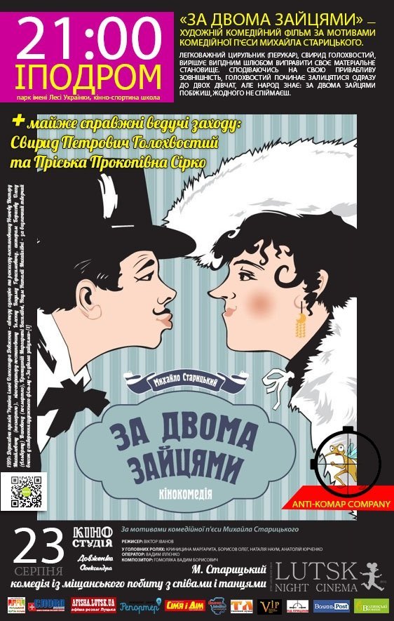 На луцькому іподромі у парку Лесі Українки демонтсруватимуть комедію із міщанського побуту зі співами й танцями за постановкою Михайла Старицького – «ЗА ДВОМА ЗАЙЦЯМИ», інформують організатори заходу.