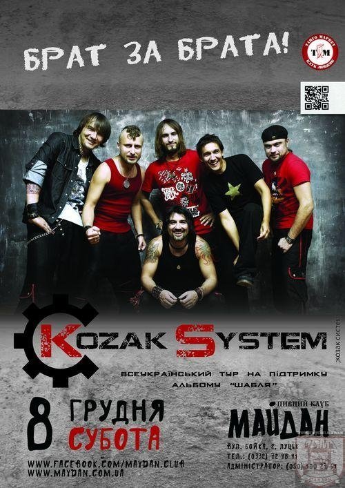 Завтра, 8 грудня, у межах Всеукраїнського туру до Луцька приїде рок-гурт «Kozak System». Музиканти презентуватимуть лучанам свій новий альбом «Шабля». Концерт відбудеться у пивному клубі «Майдан», що на вулиці Бойка 2а, о 21:00.