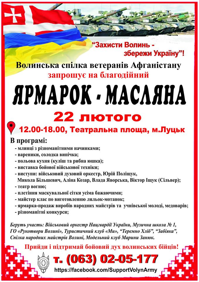 Волинська спілка ветеранів Афганістану запрошує лучан та гостей міста на благодійний ярмарок «Масляна».