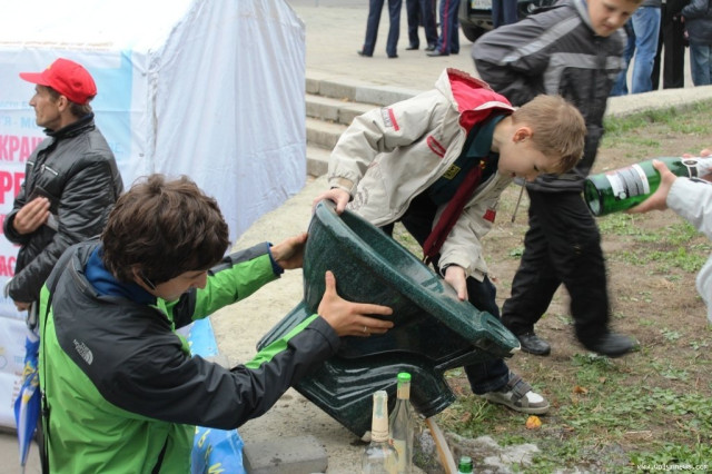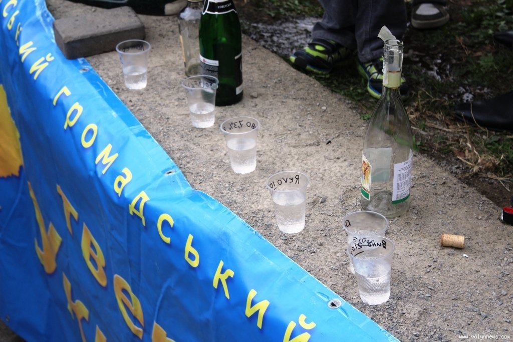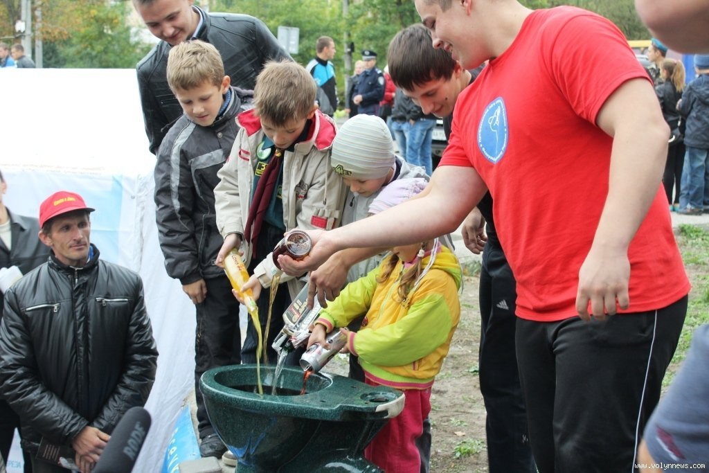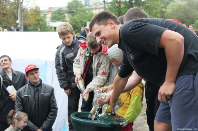 Після цього дітям-волонтерам та учасникам турніру стронгменів запропонували вилити різні види алкоголю в унітаз. Вміст унітазу під схвальні вигуки публіки вилили на землю.