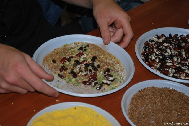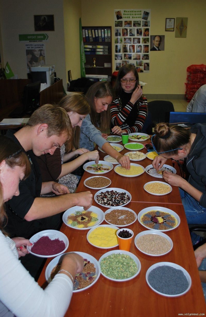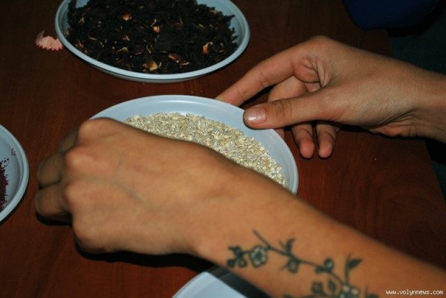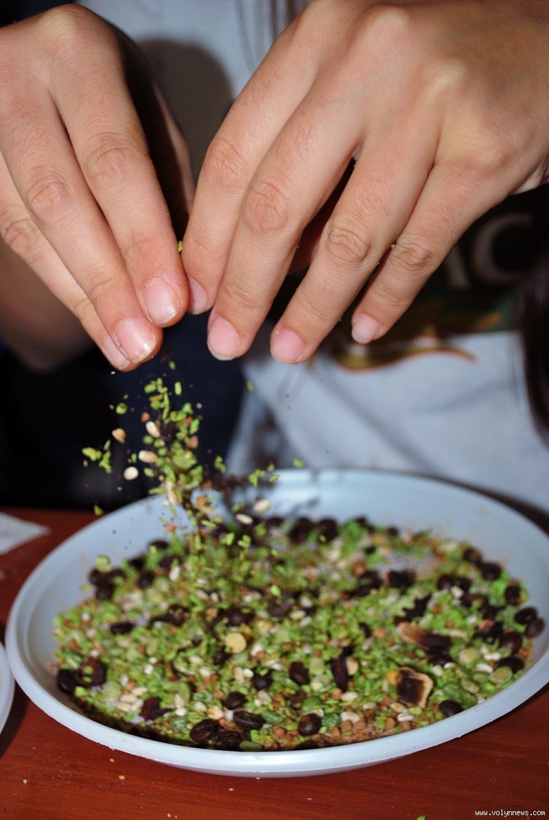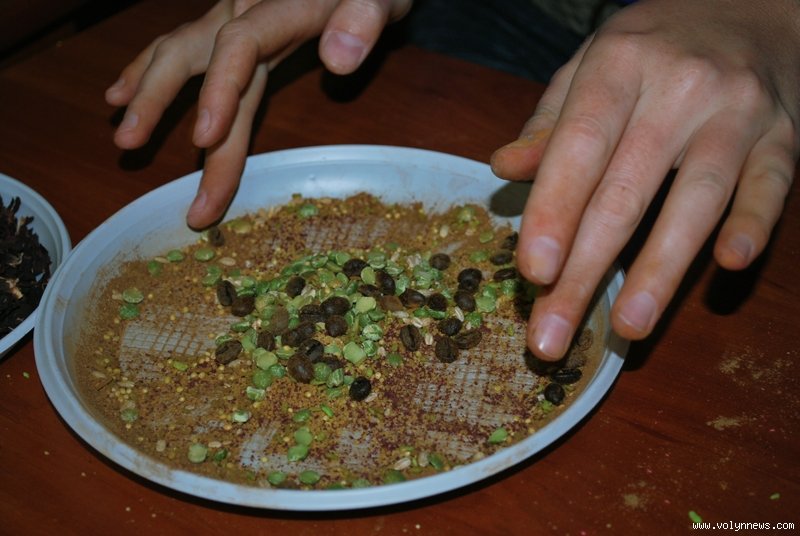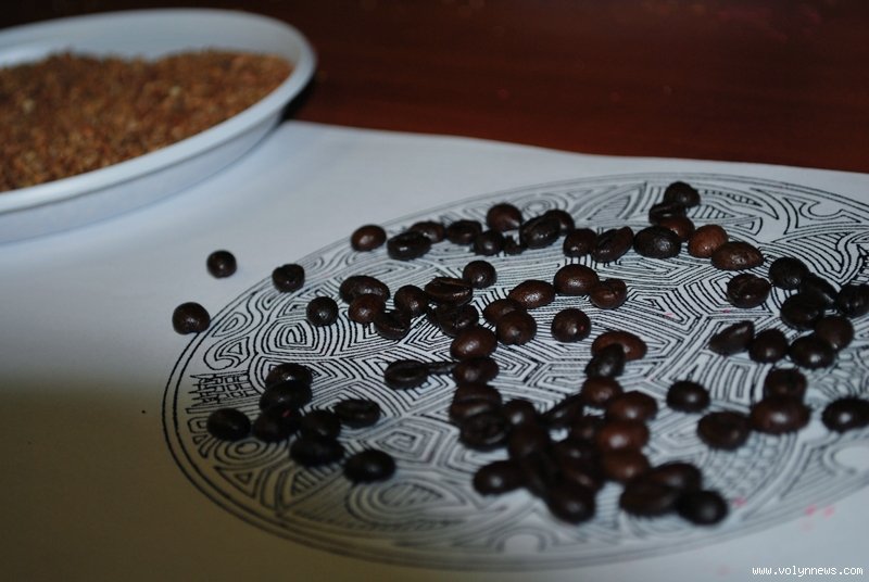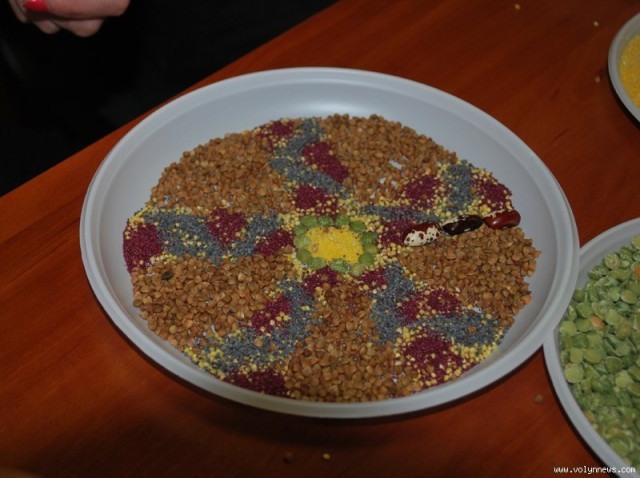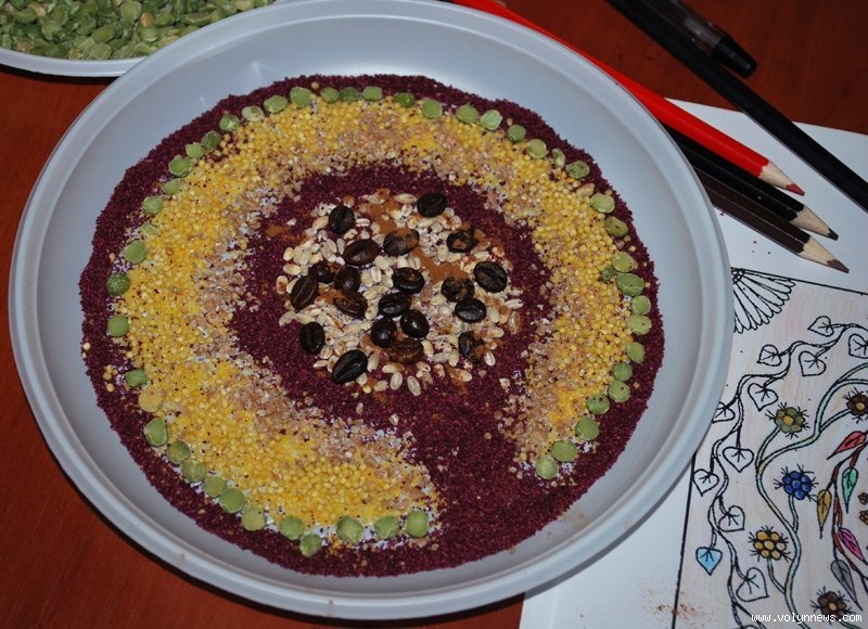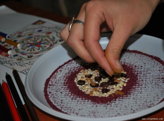 Опісля розфарбовування організатори поставили на стіл тарілки з крупами, спеціями, кавою та іншими їстівними інгредієнтами. На здивування усіх присутніх вони виявилися придатними для мистецьких маніпуляцій. Насипаючи пшоно, корицю чи горох, новоспечені художники створювали візерунки прямо у тарілці.