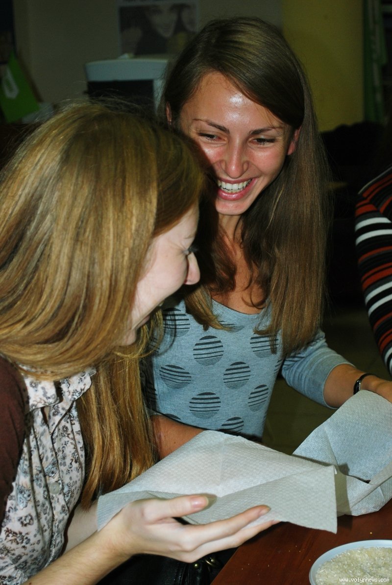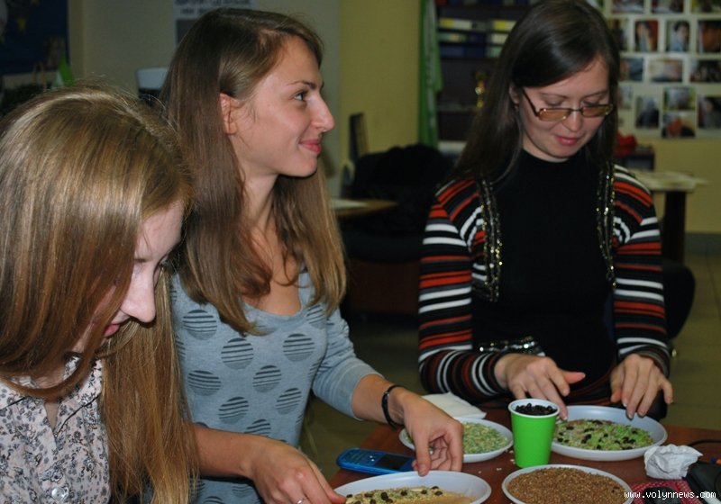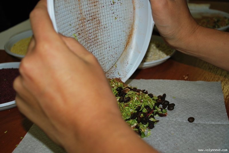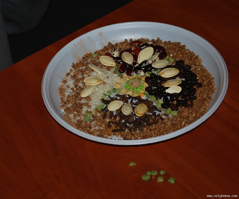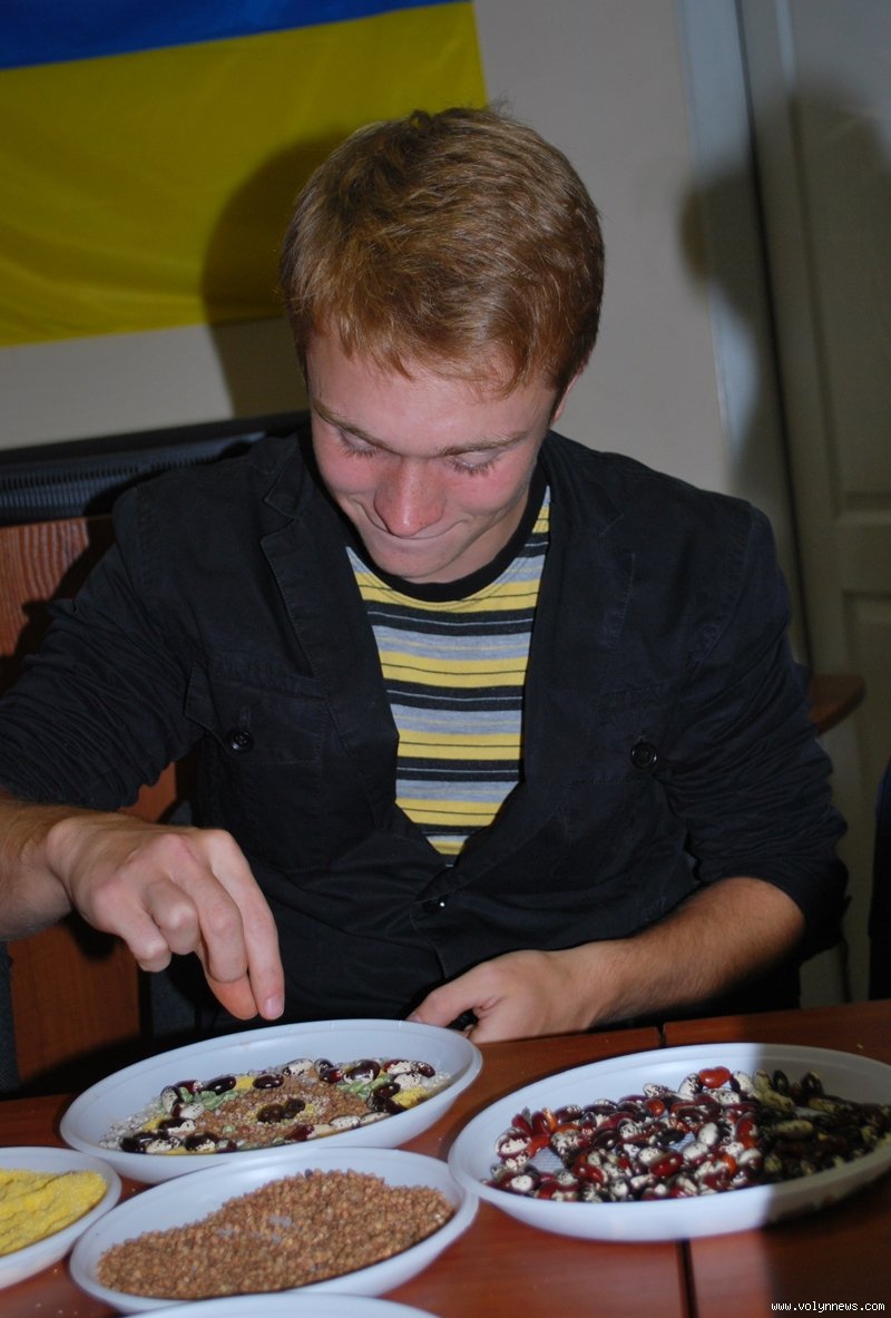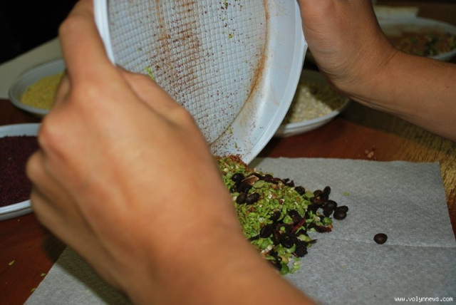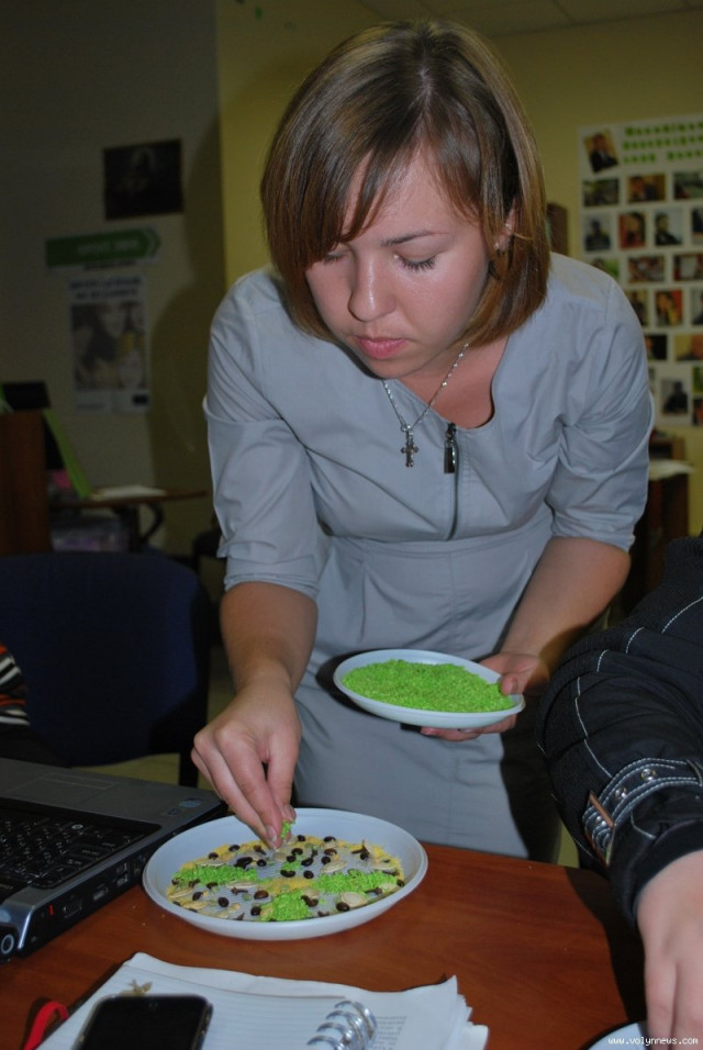 Опісля розфарбовування організатори поставили на стіл тарілки з крупами, спеціями, кавою та іншими їстівними інгредієнтами. На здивування усіх присутніх вони виявилися придатними для мистецьких маніпуляцій. Насипаючи пшоно, корицю чи горох, новоспечені художники створювали візерунки прямо у тарілці.