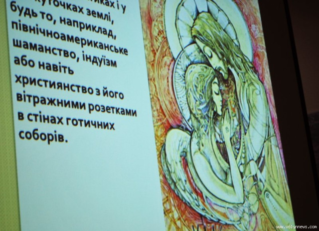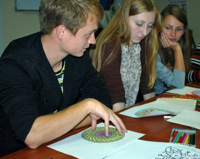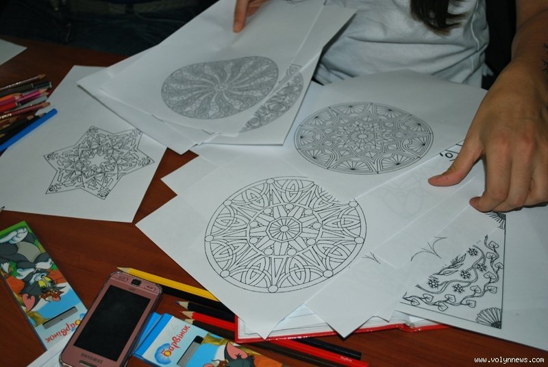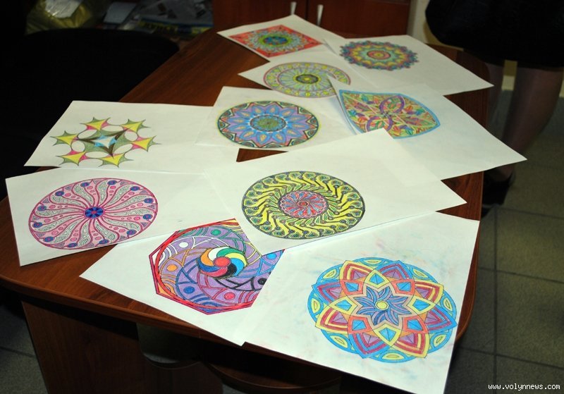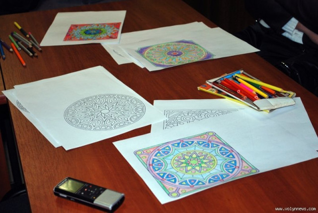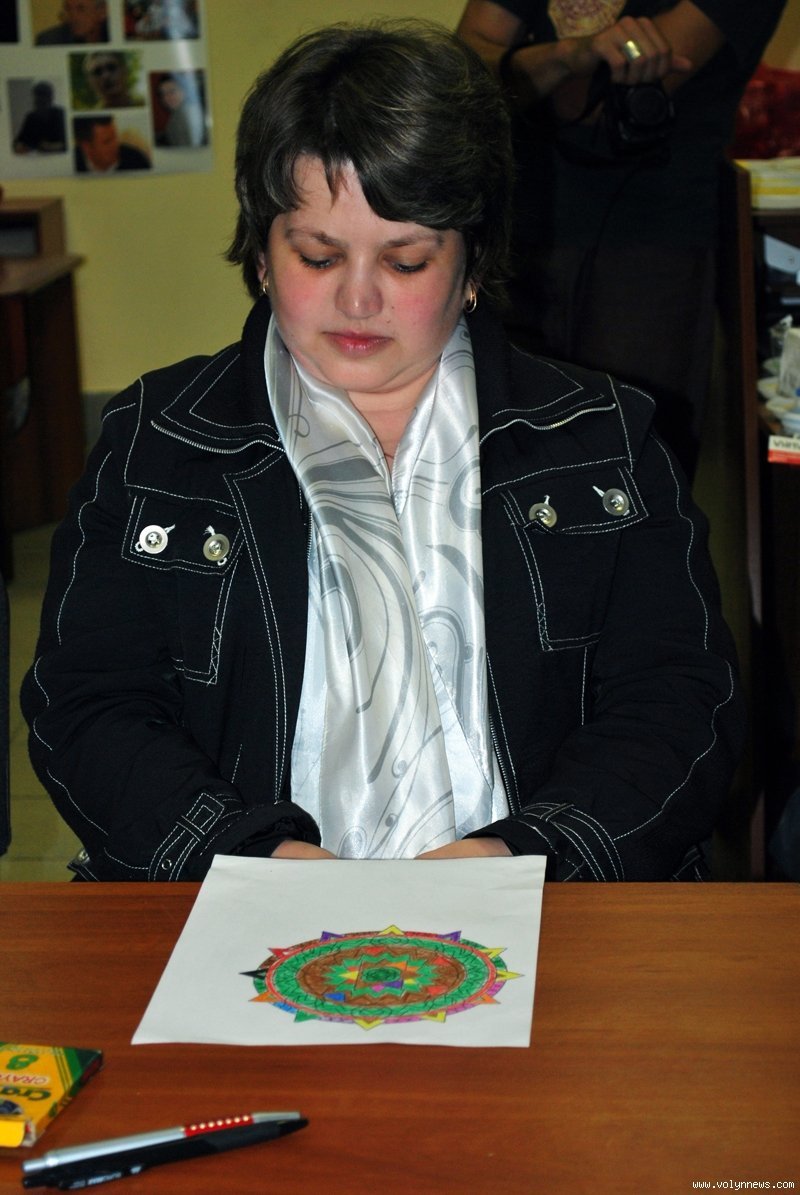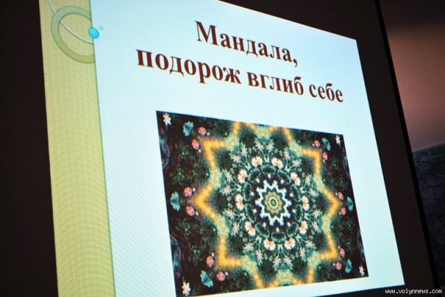 Після представлення учасників психолог показала коротеньку презентацію про мистецтво мандали та розповіла про випадки застосування цієї практики у своїй роботі. За словами експерта, такий буддистський знак існує в природі у вигляді квітів, фруктів, кристалів, сніжинок, зіниць очей. «Нині цей символ використовується в психотерапії як засіб досягнення повноти розуміння власного «я». Також створення і розмальовування мандал використовується як психотерапевтичний ефект, заспокійливий, зосереджувальний», - додала Марина Пахачук.