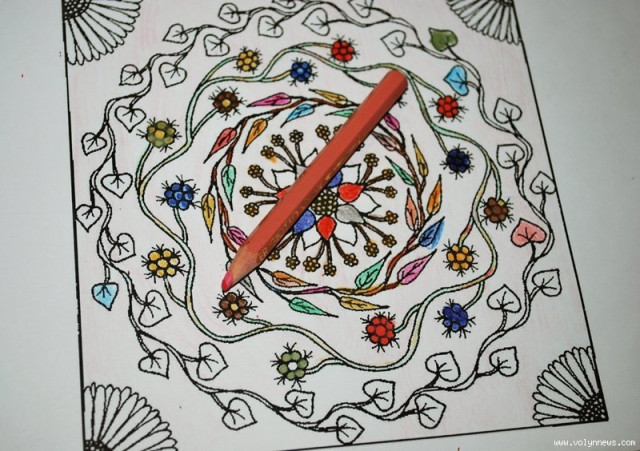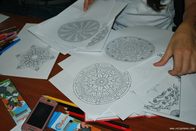 Згодом учасники арт-терапії перейшли безпосередньо до практичної частини заходу. Олена Ковальчук роздала зображення з мандалами. Зокрема наголосила на тому, що кожен може вибрати собі картинку до смаку. Вибір був великий, тому гості довго вагалися перед тим, як обрати свій малюнок. Визначившись з символом, присутні почали розмальовувати їх. Задля налаштування на правильну «хвилю» ввімкнули заспокійливу музику.