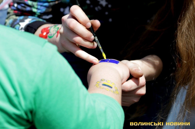 У Луцьку на Театральному майдані усіх охочих «прикрашали» європейською та українською символікою.