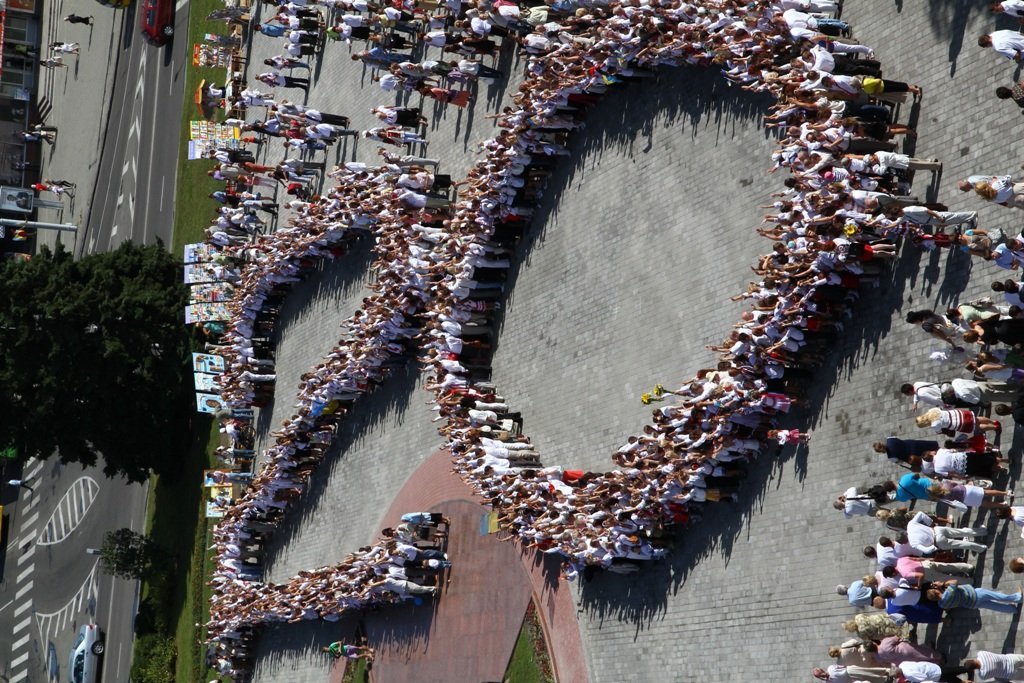 Її започаткували у Луцьку у 2007 році. У 2010 році на подібному флеш-мобі учасники вибудовували український герб, також були слова «Україна» і «Луцьк».