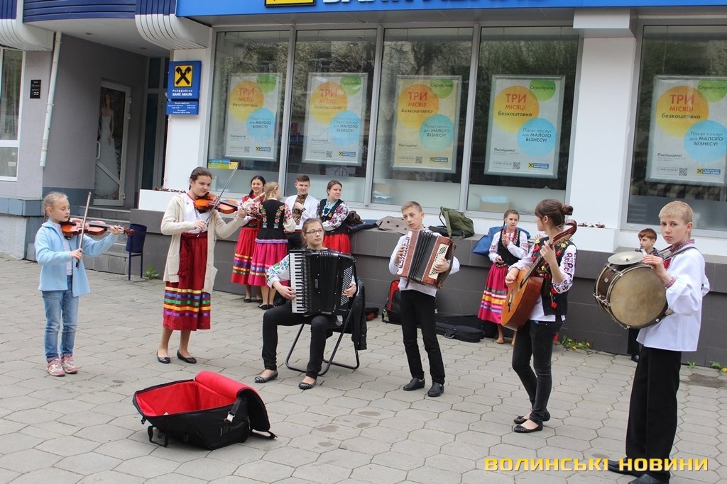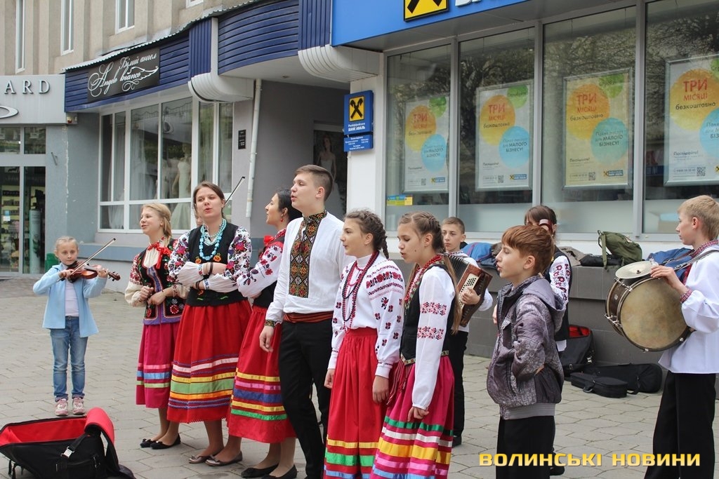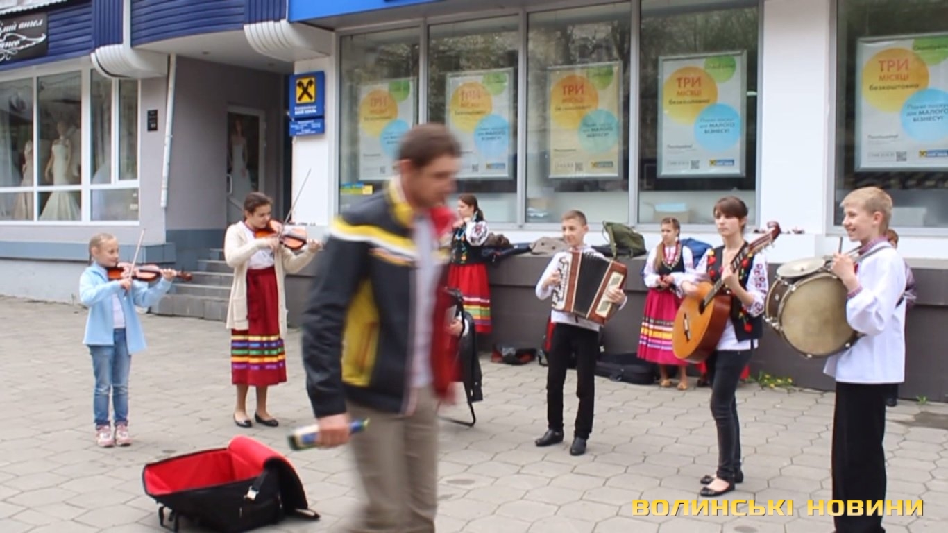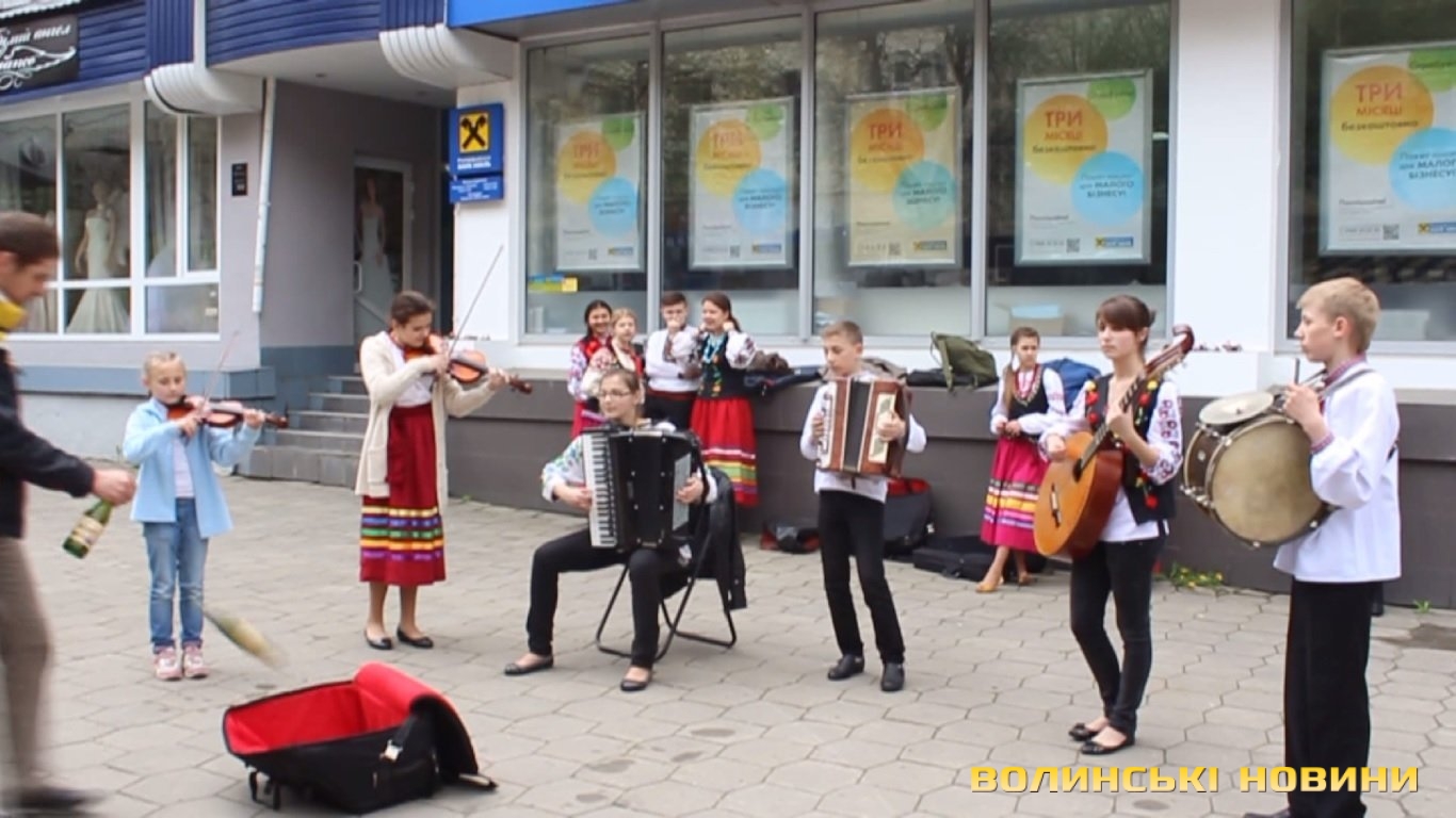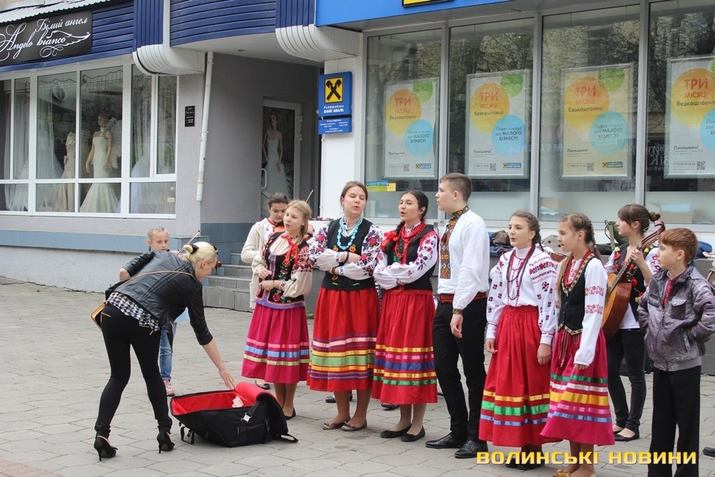 Так, пройшовши декілька метрів вулицею Лесі Українки 21 квітня, можна було почути веселий спів та гру баяна, акордеона та скрипки. Тут лучан розважав народний дитячий ансамбль «Волиняни». Навколо юних музик зібралось чимало перехожих, які слухали та підспівували їм. Чимало людей в знак подяки кидали у футляр артистам гроші, але серед них були й такі, які віддячити за запальні пісні вирішили досить оригінальним способом.