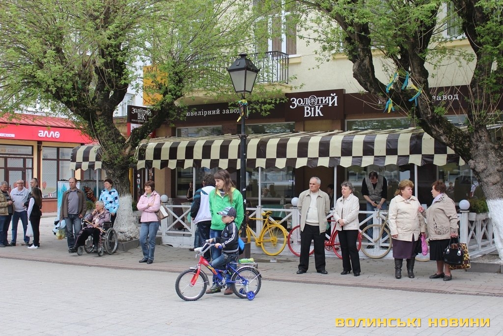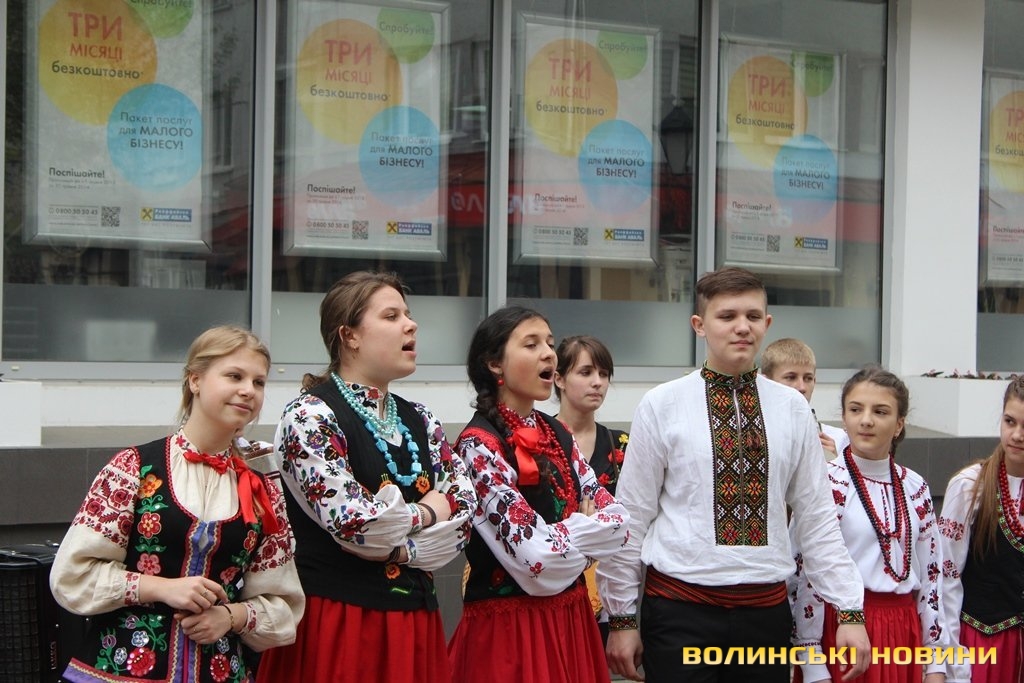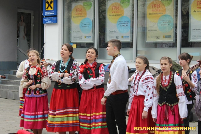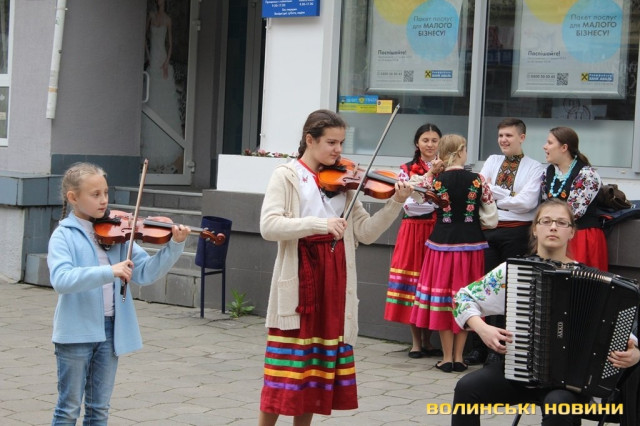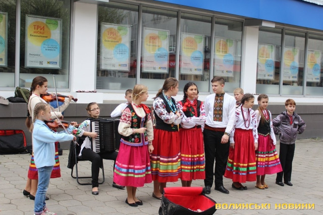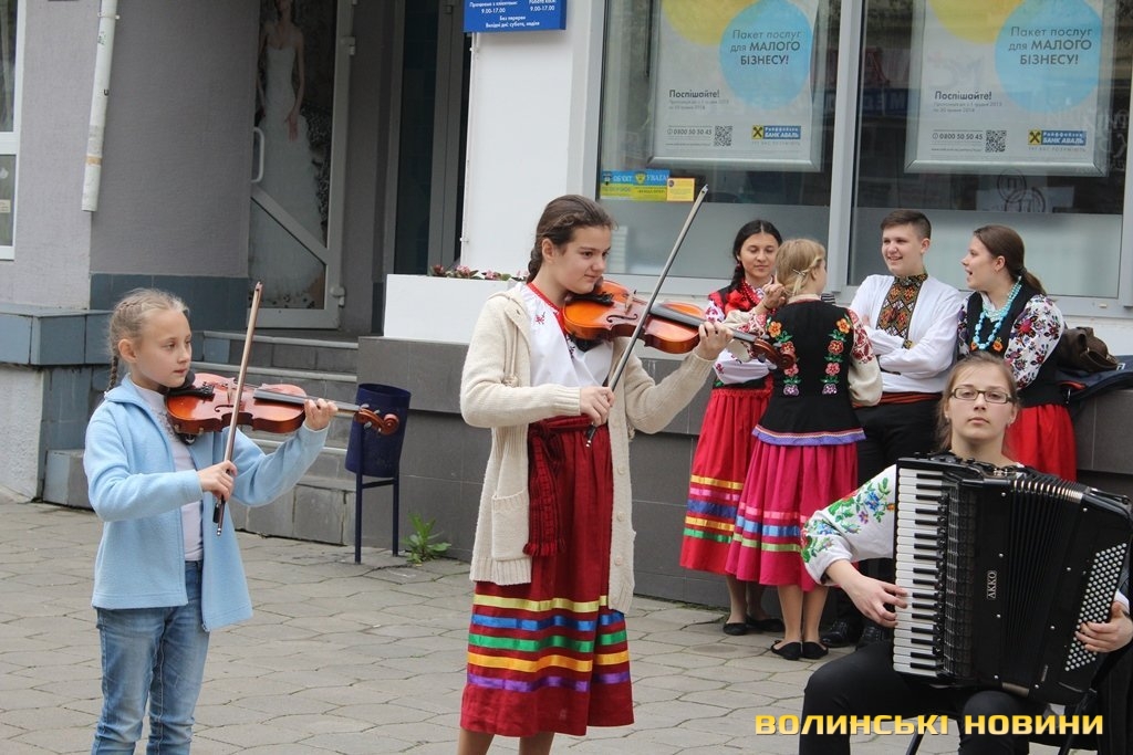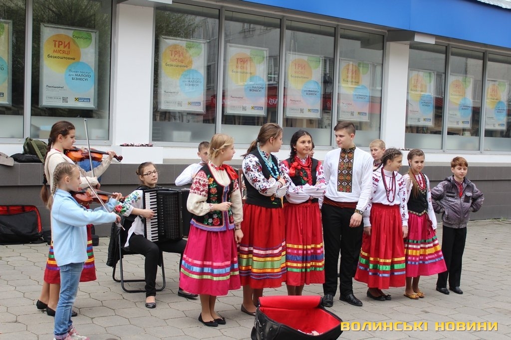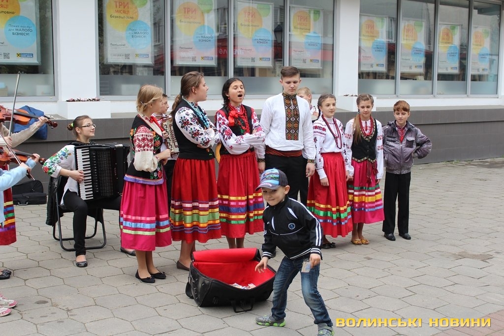 Так, пройшовши декілька метрів вулицею Лесі Українки 21 квітня, можна було почути веселий спів та гру баяна, акордеона та скрипки. Тут лучан розважав народний дитячий ансамбль «Волиняни». Навколо юних музик зібралось чимало перехожих, які слухали та підспівували їм. Чимало людей в знак подяки кидали у футляр артистам гроші, але серед них були й такі, які віддячити за запальні пісні вирішили досить оригінальним способом.