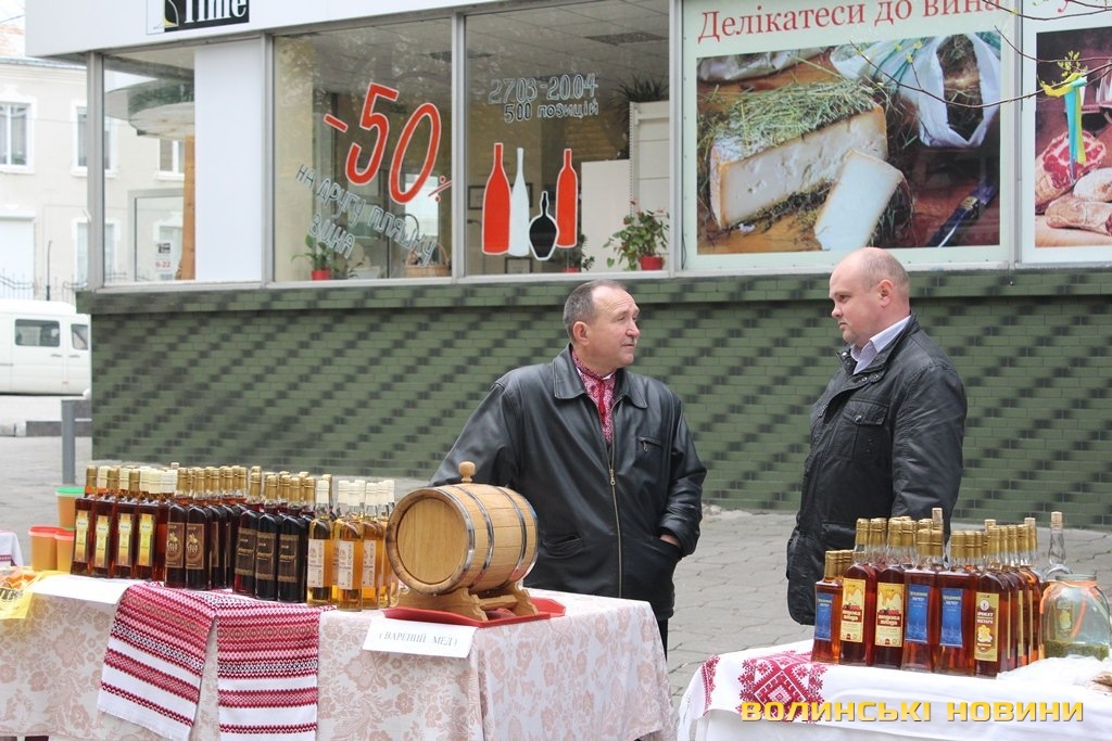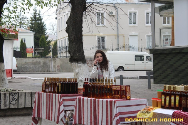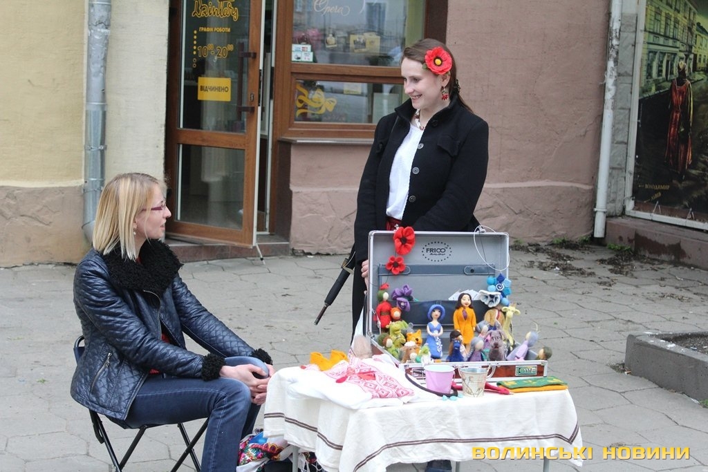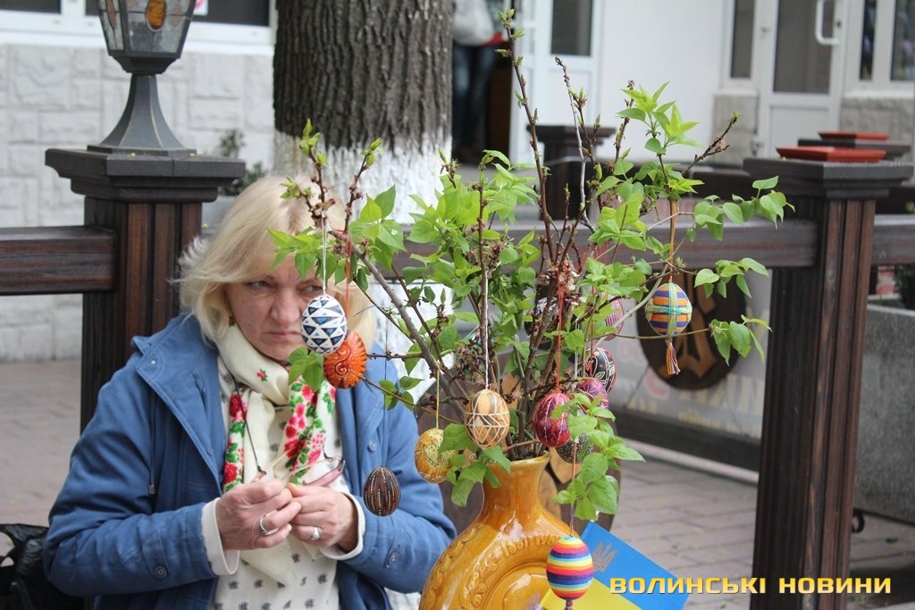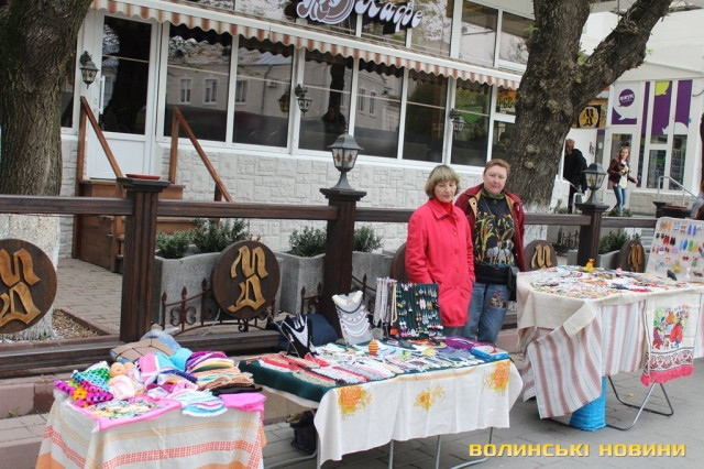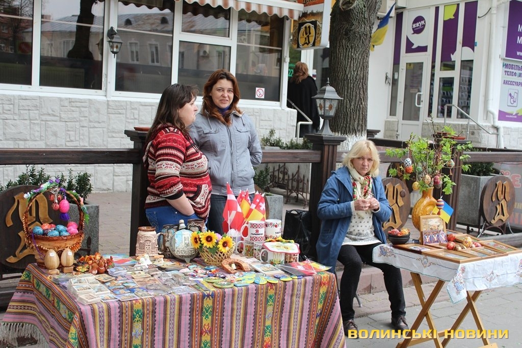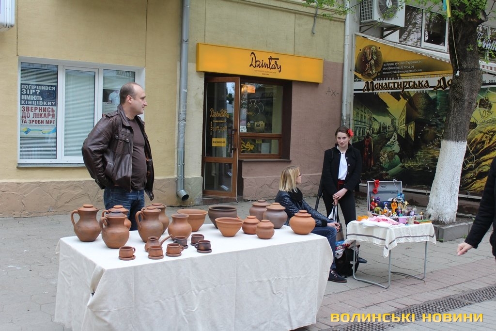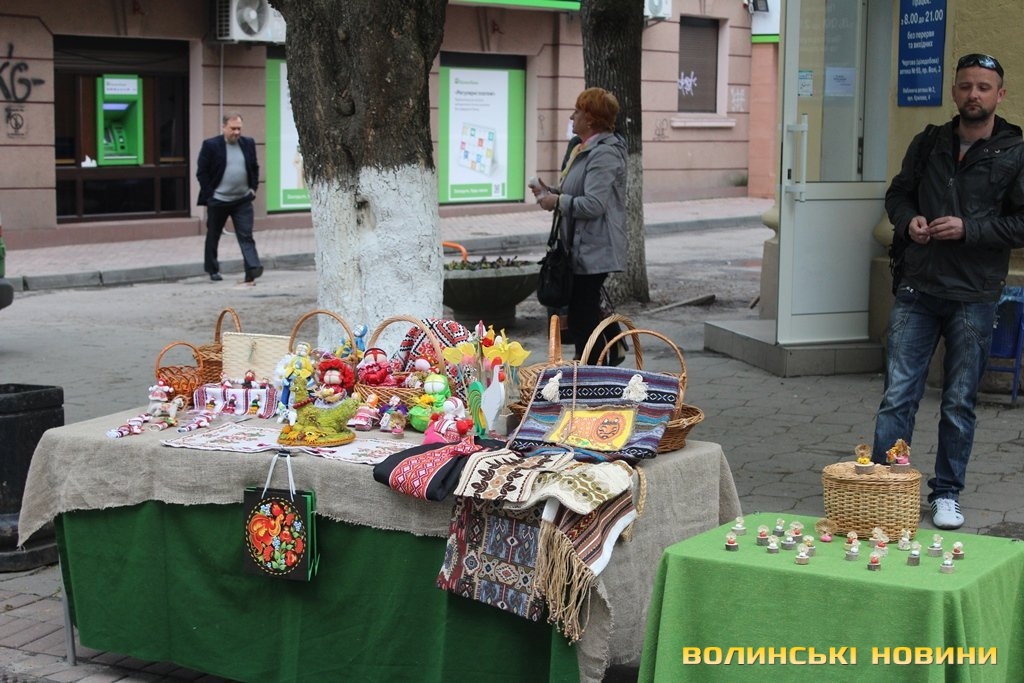 Далі вулицею Лесі Українки людей зустрічали ятки, щедро вкриті українськими сувенірами. Тут можна було знайти не лише біжутерію та інші прикраси, але й різноманітну Великодню атрибутику. Зокрема писанки, крашанки, а також ляльки ручної роботи, прикрашені різнобарвними стрічками і бісером тощо. Зовсім поруч продавали справжній глиняний посуд, у подібному готували та їли ще за часів козацтва.Навпроти охочі могли почастуватись хваленою волинською медовухою, а також придбати різноманітні продукти бджолярства.Ансамбль "Волиняни"