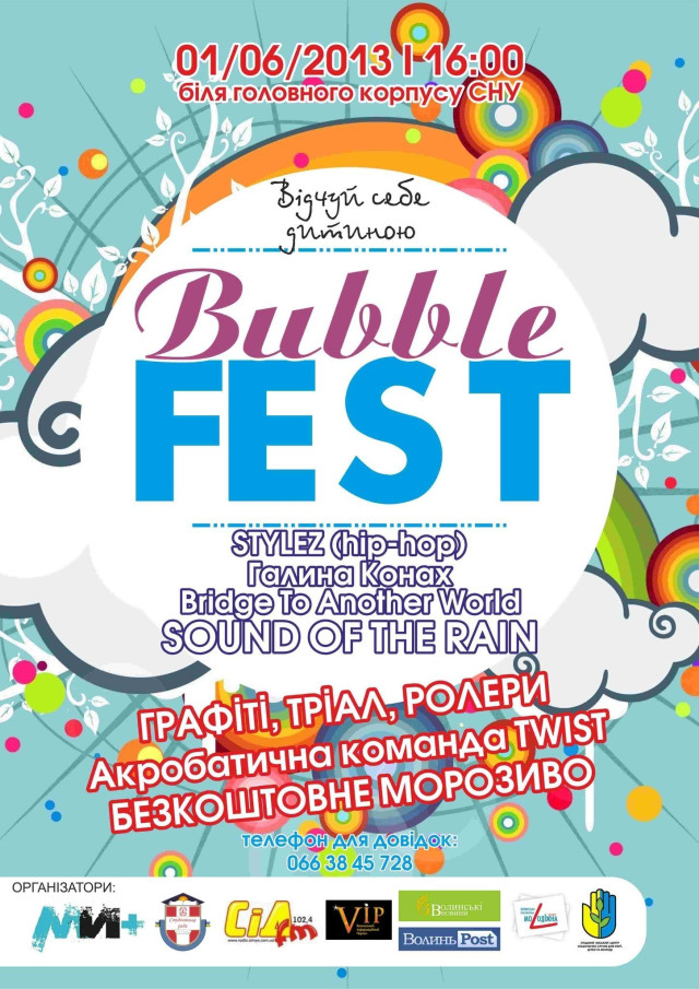 Захід розпочнеться о 16:00 біля головного корпусу СНУ імені Лесі Українки. Офіційне відкриття і запуск бульбашок стартуватиме о 18:00. Відвідувачів розважатимуть Галина Конах, група Sound Of The Rain, STYLEZ (hip-hop), акробатична команда TWIST.