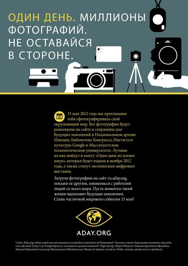 Глобальна мета цієї ініціативи – показати, як різні люди у різних куточках планети проводять свій день, що їх оточує, і що для них важливо. Аби взяти участь в акції, не обов’язково бути професійним фотографом. Як результат, усі знімки об’єднає єдиний інтерактивний простір, в якому можна буде обмінюватися фотографіями та надихати прийдешнє покоління.