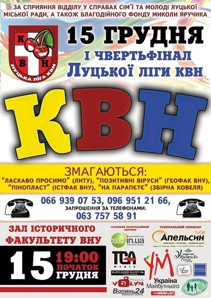 Луцька ліга КВН, в якій беруть участь лише волинські команди, 15 грудня проведе першу чвертьфінальну гру.
