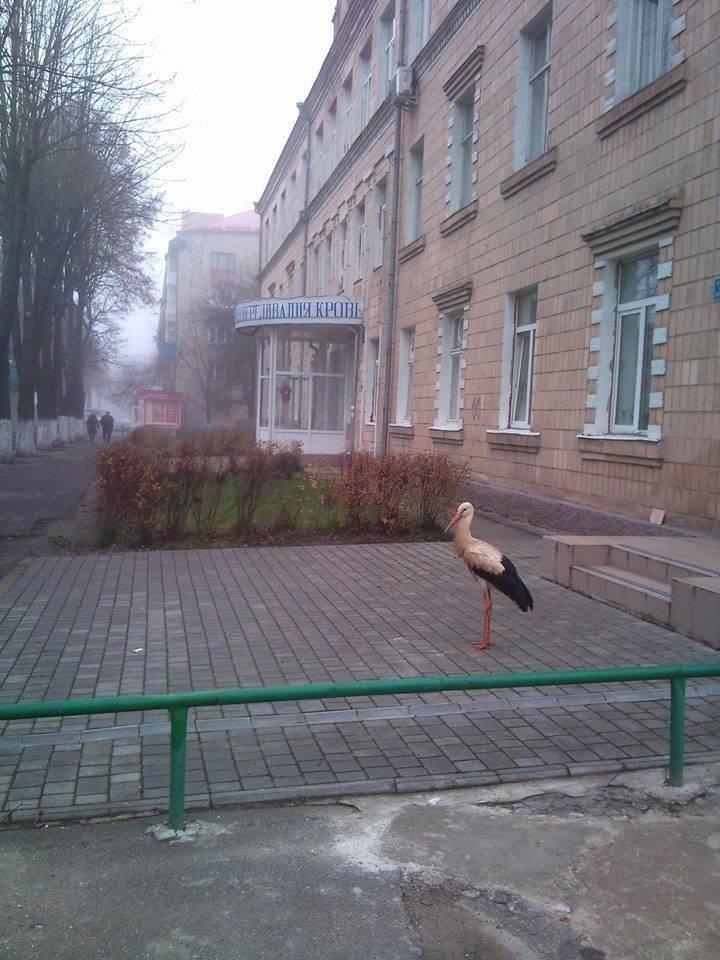 До обласної станції переливання крові приблудився лелека. Вранці працівники установи спостерігали, як птах спокійнісінько перейшов дорогу та почимчикував до воріт станції переливання крові.